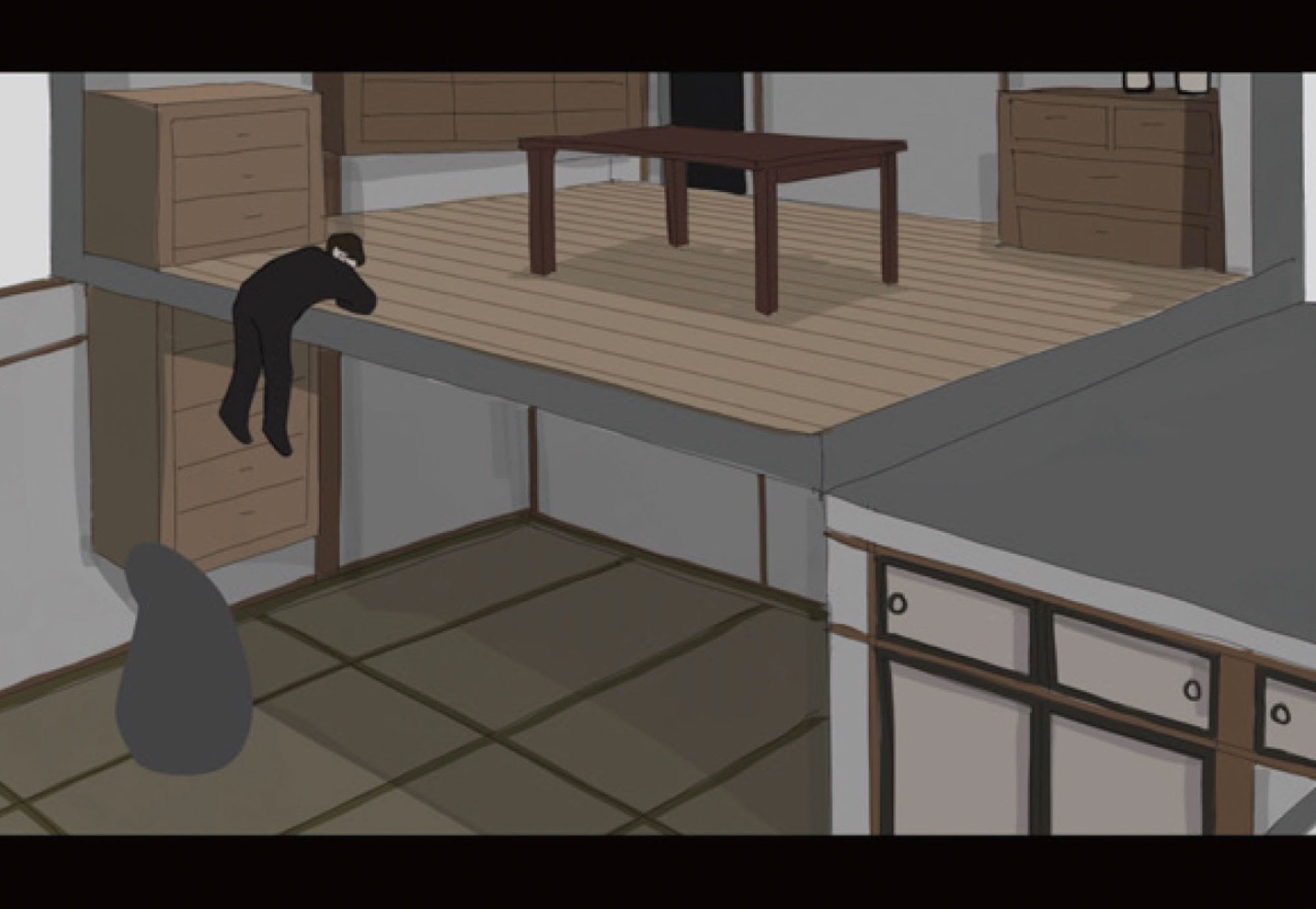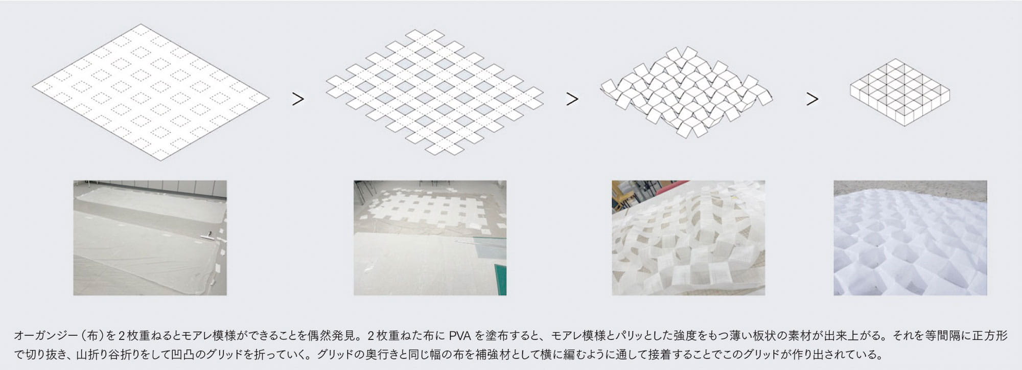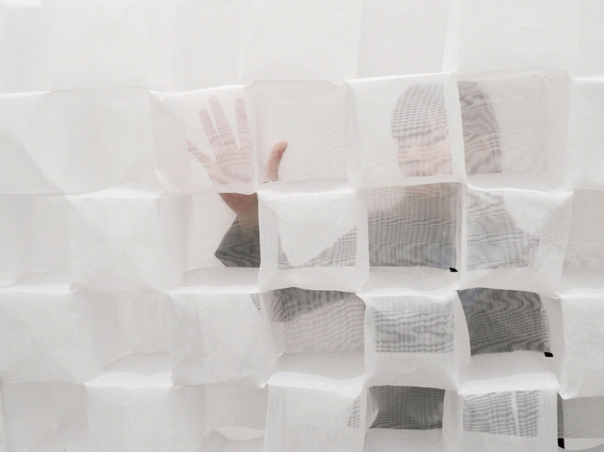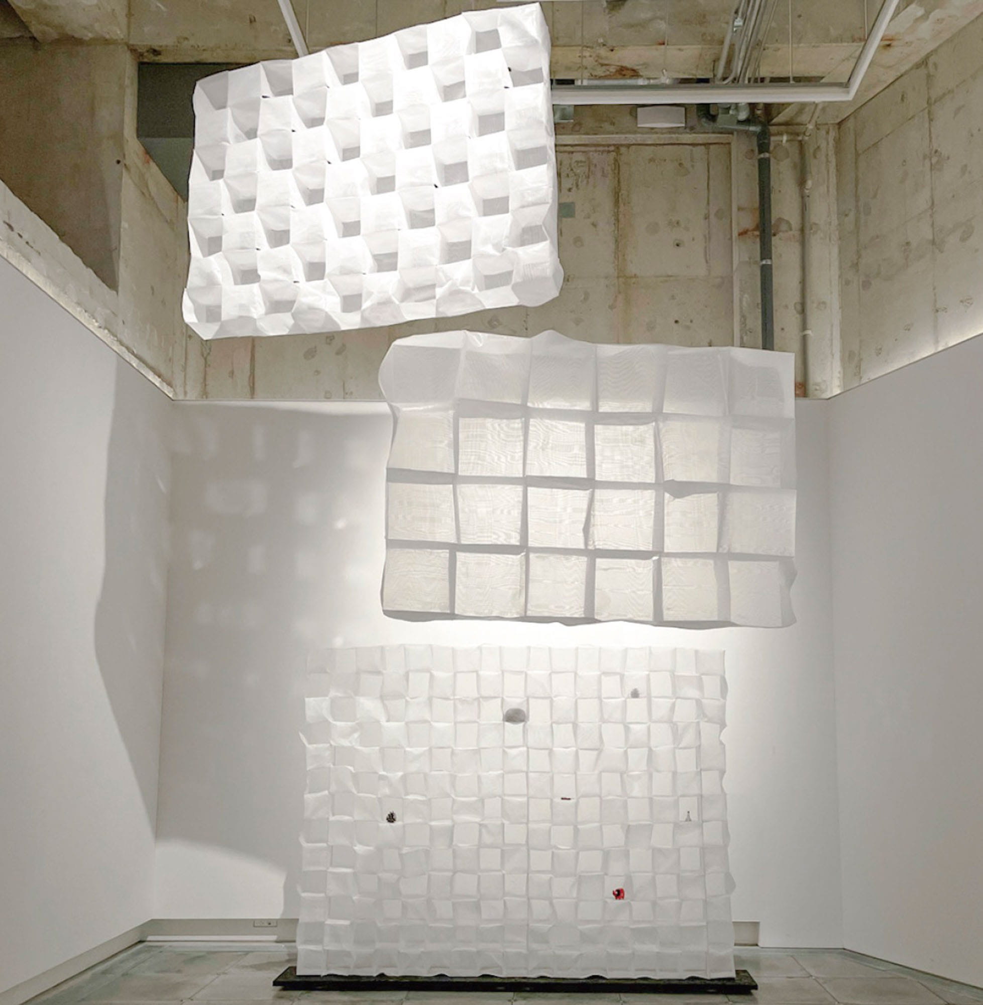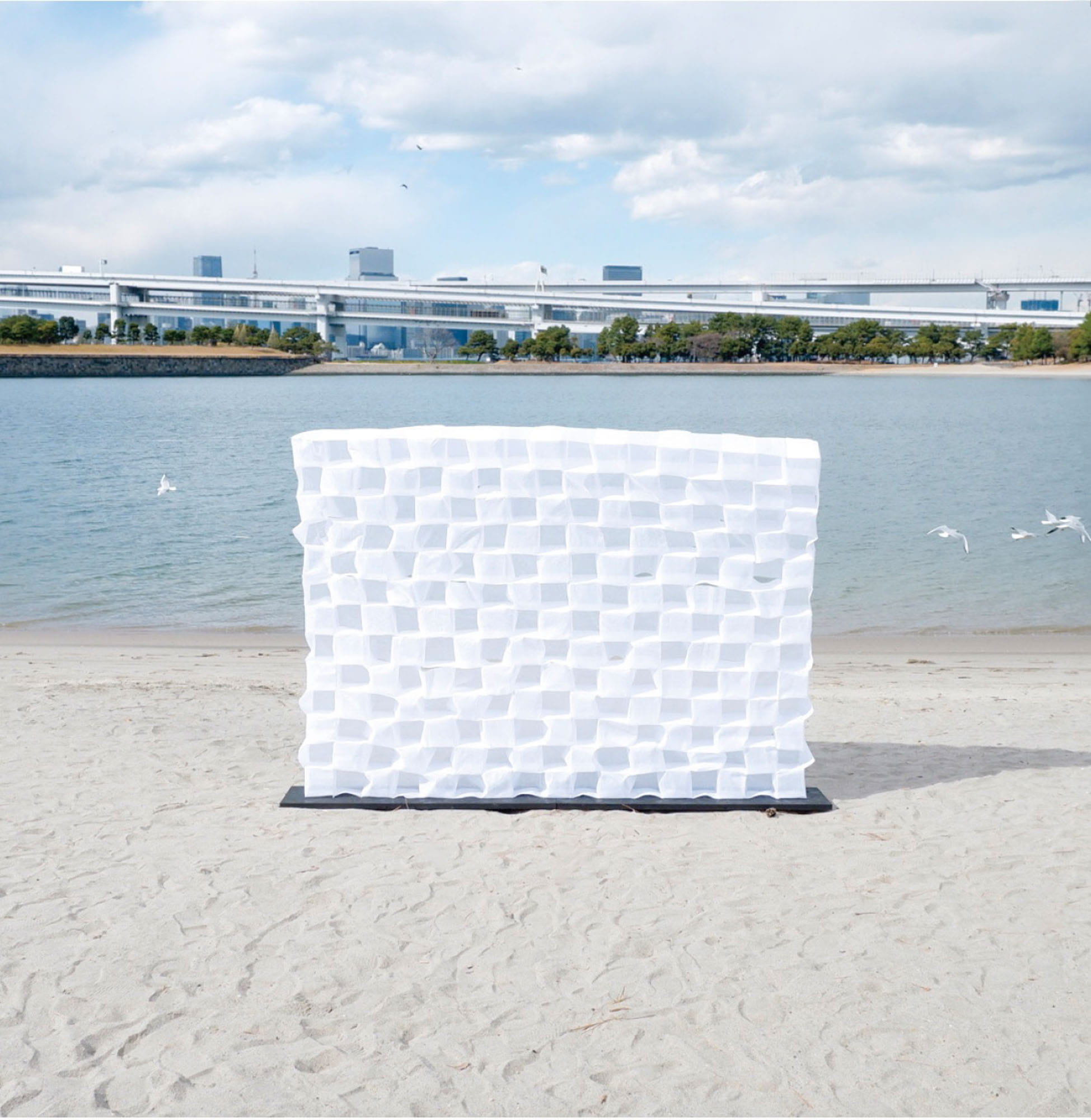 - 空間に幸せを広げる「空気以上家具未満、パーテーション以上棚以下」の作品である。自立するはずのない布が自立している不思議さや、布の柔らかさ、不定形さが、空間に存在していることを感じさせないような佇まいをつくり出す。帰り道に拾った小さな植物や摘んだ花、自分のお気に入りのものなどをそこに置き、ふとした瞬間に置いたものが目にとまり、記憶が蘇ることで空間に幸せが広がり漂うのではないかと考える。