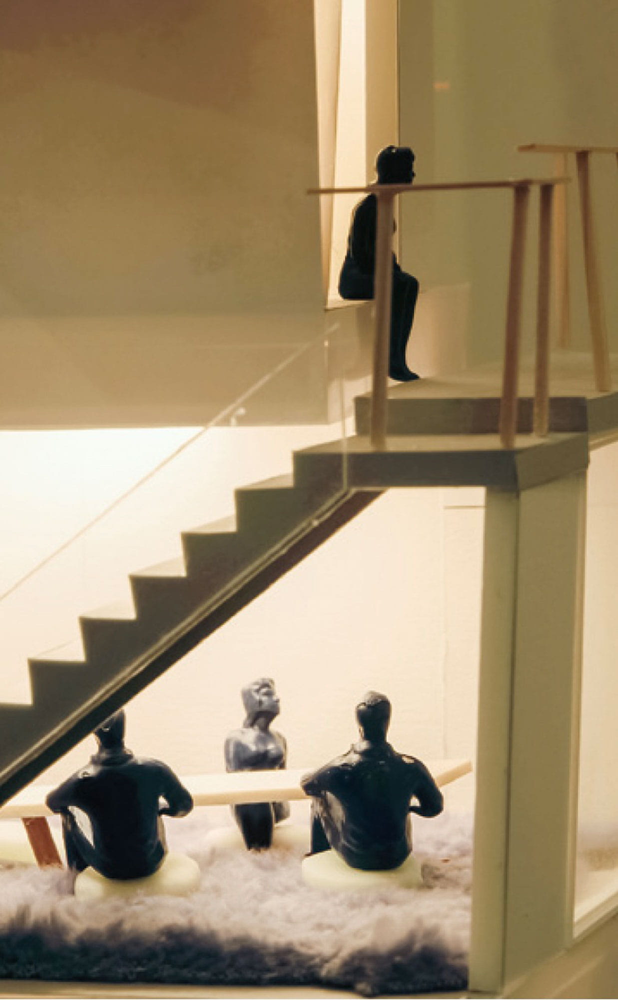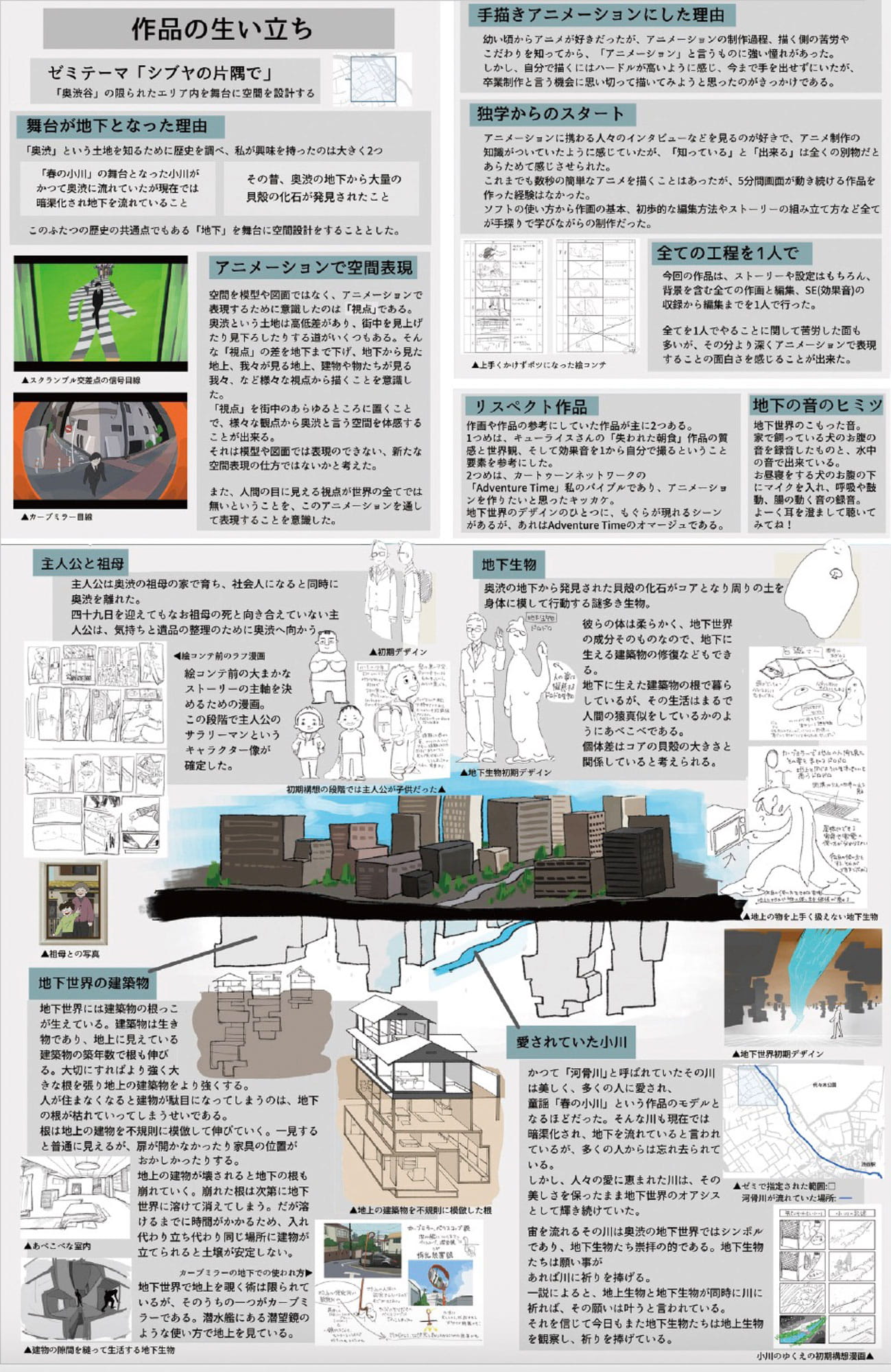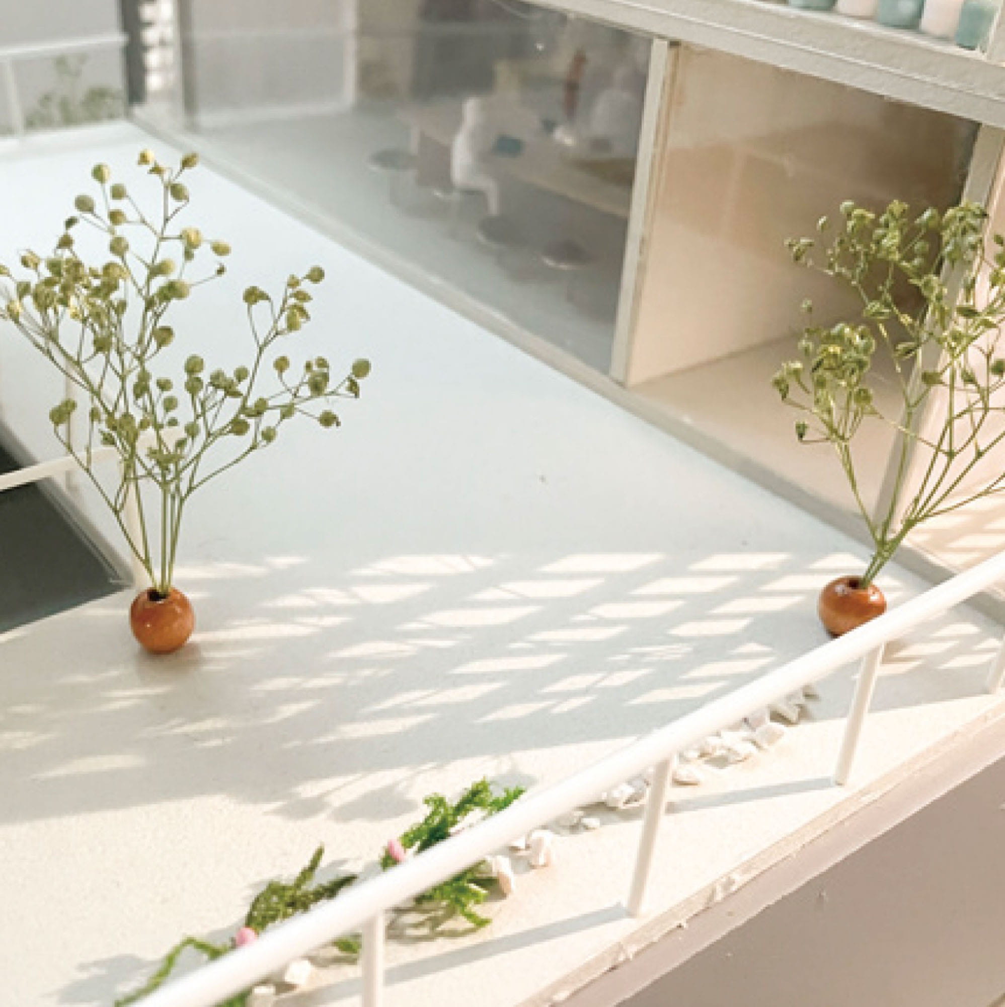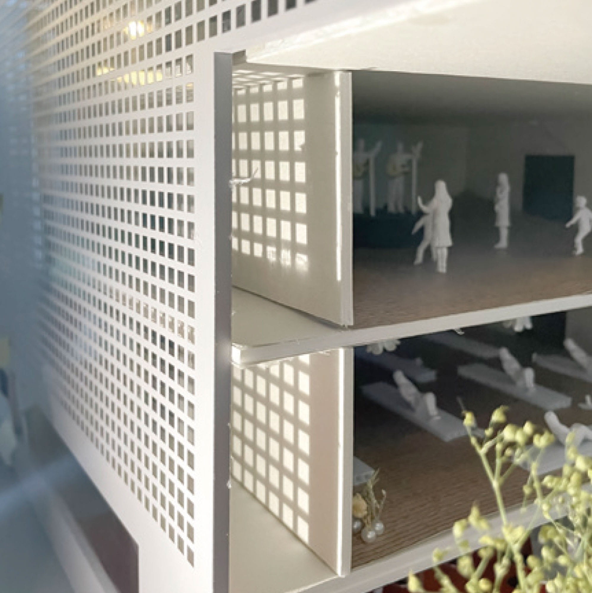 - 神山町の高層ビルが多いエリアで、光と影のコントラストにより自然の要素を感じさせ、都市の喧騒から解放される住宅と商業の複合建築。人々の繋がりが希薄になりがちな現代。他者を認識し、共に自分を認識できるよう、商業空間ではさまざまなイベントや展示を開催する。建築は空間を提供するものであるが、空間の意味や価値は人によって見出されると考える。人がどう過ごしどう感じるかで建築の存在意義を生みだしてほしい。建築物はただの箱に過ぎないが、人が存在することに意味を持つ箱になることを目指す。