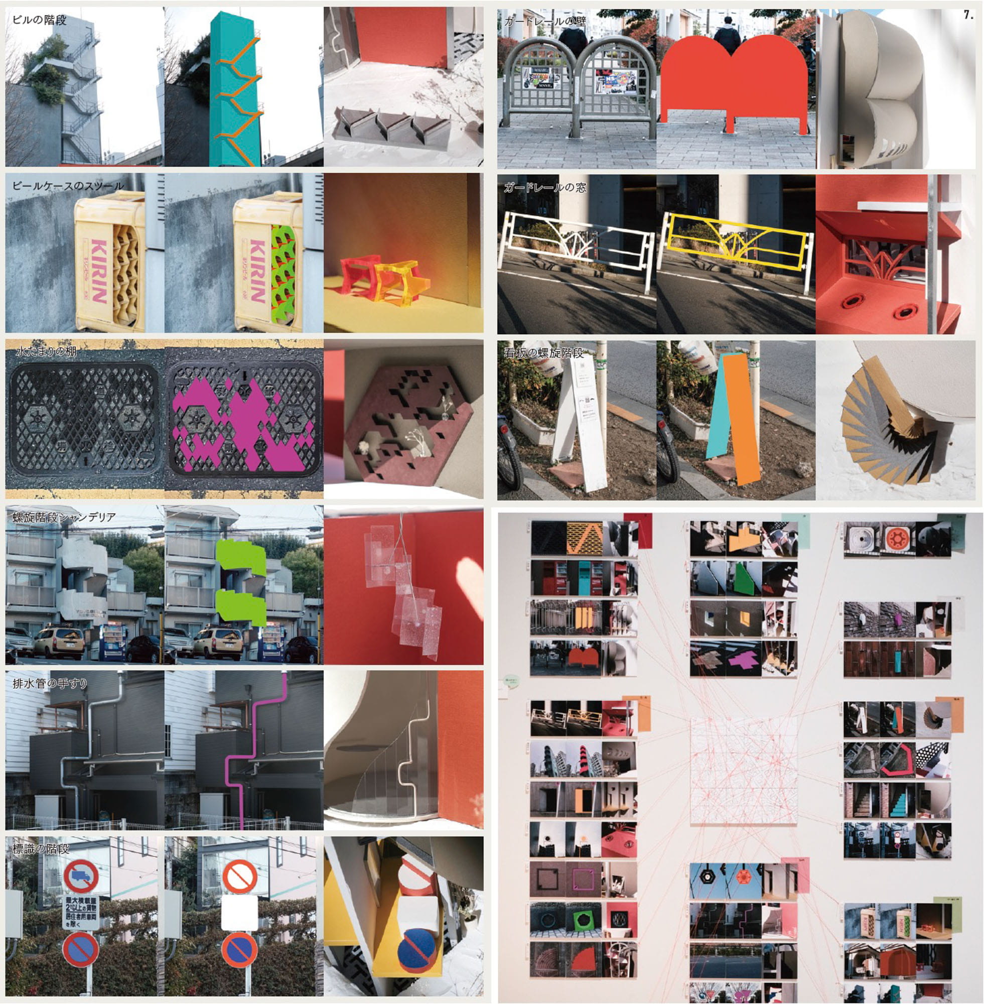 - 建築の生成過程に疑問を持った。空間や建築がもっと我々の日常と地続きにならないだろうか。そこで日常に存在する様々なモノを元に、空間や建築を構成する手法とプロセスを研究した。「奥渋」と呼ばれる神山町エリア300m × 300m を敷地とし、そこで見つけたモノを一定のルールに基づき組み合わせ、1つの建築を作る。見つけるモノは、奥渋にある民家の壁、水たまり、道路標識、道端に落ちる影など、様々。実際にこんな建築が生まれれば「この床、私の家の外壁の形なんだよね」なんて会話が生まれたりするのだろうか。