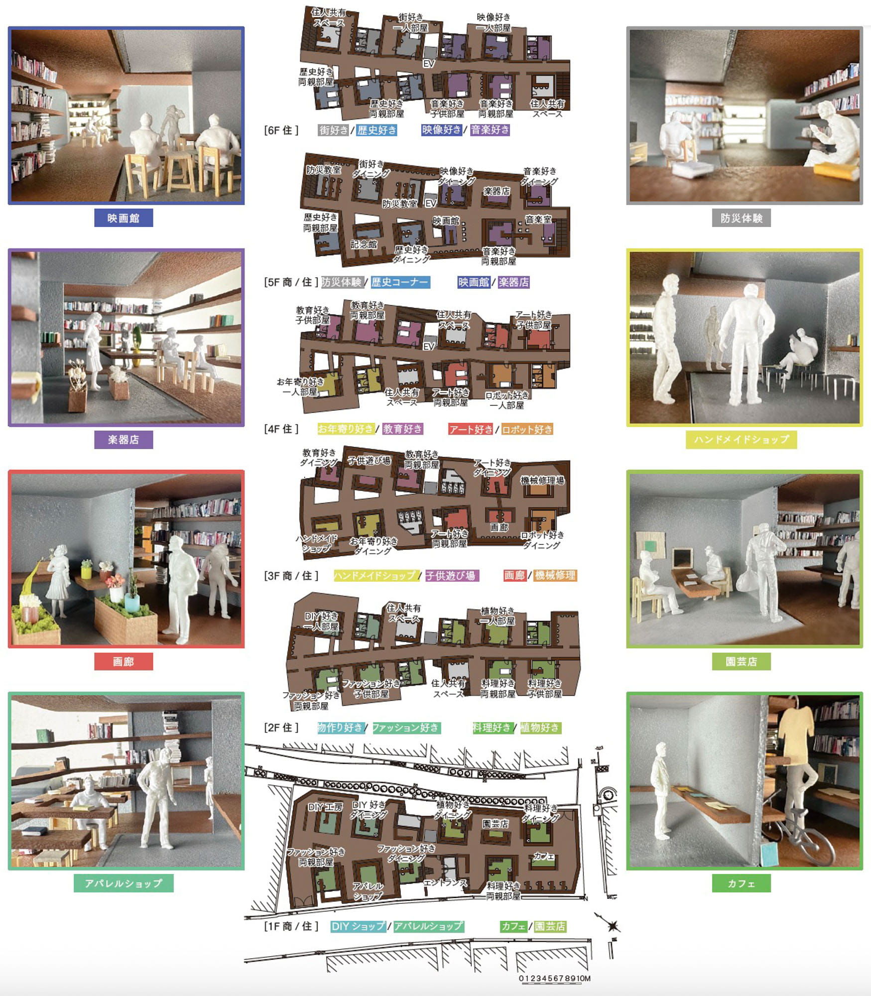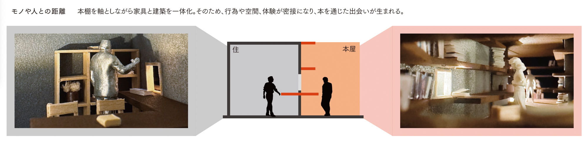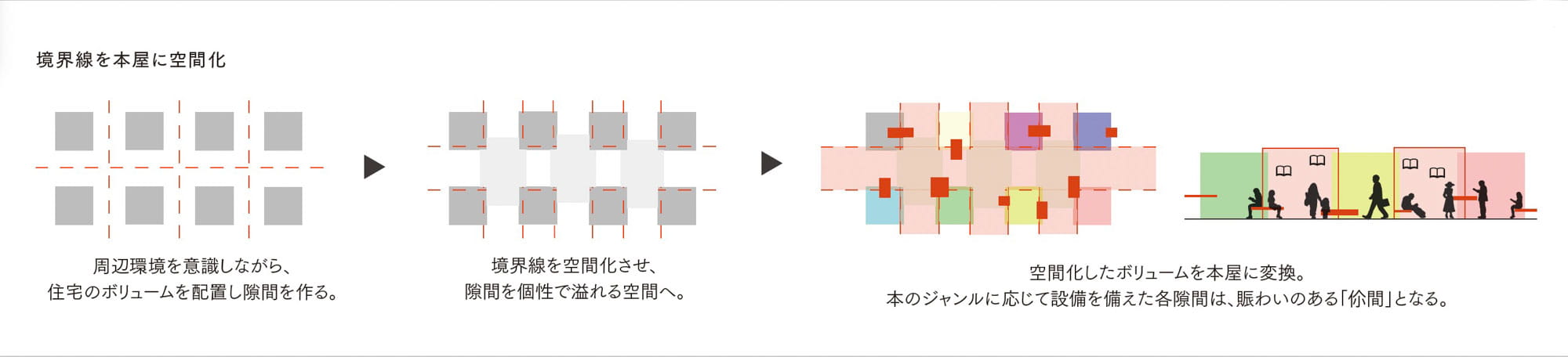 - 人と人との出会いや交流が生まれる建物の隙間を「伱間(すきま)」と名付ける。タワー型の独立した住空間の間に、本棚で構成された空間を差し込むことで、個人と街との新たな関係性を生み出し、街並みにも緩やかなつながりと広がりをもたらすことを目指す。この「伱間」」は、都市生活者のプライバシーを守りつつ、来訪者が立ち寄れる「交流が生まれる専門書店」として機能する。また単なる商業施設ではなく、日常に溶け込む暮らしの一部となり、本を介して趣味を深めたり、偶然の出会いや新たな発見を生み出す場となる。