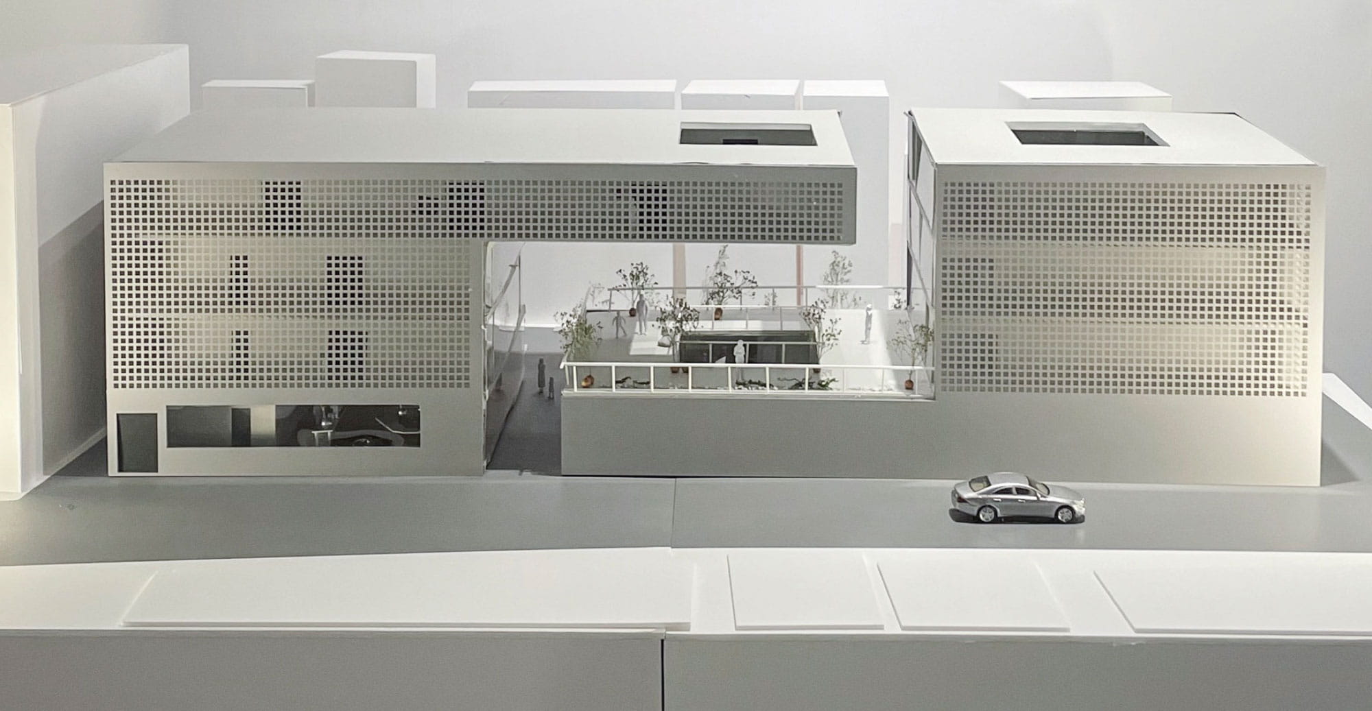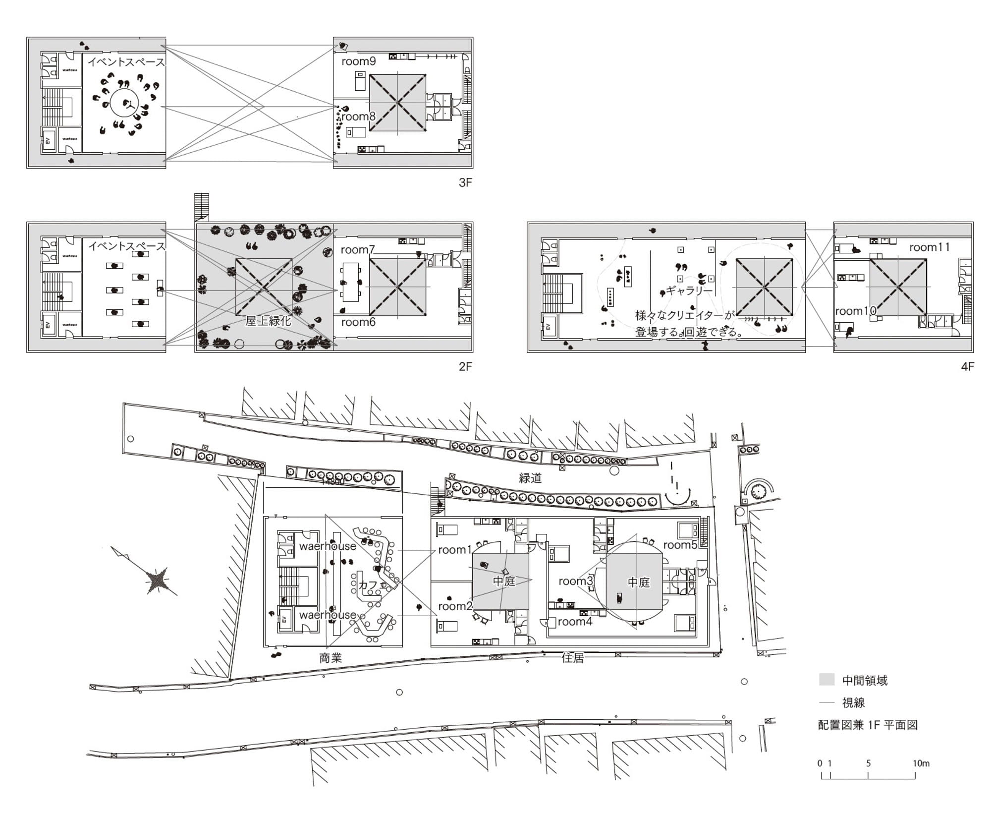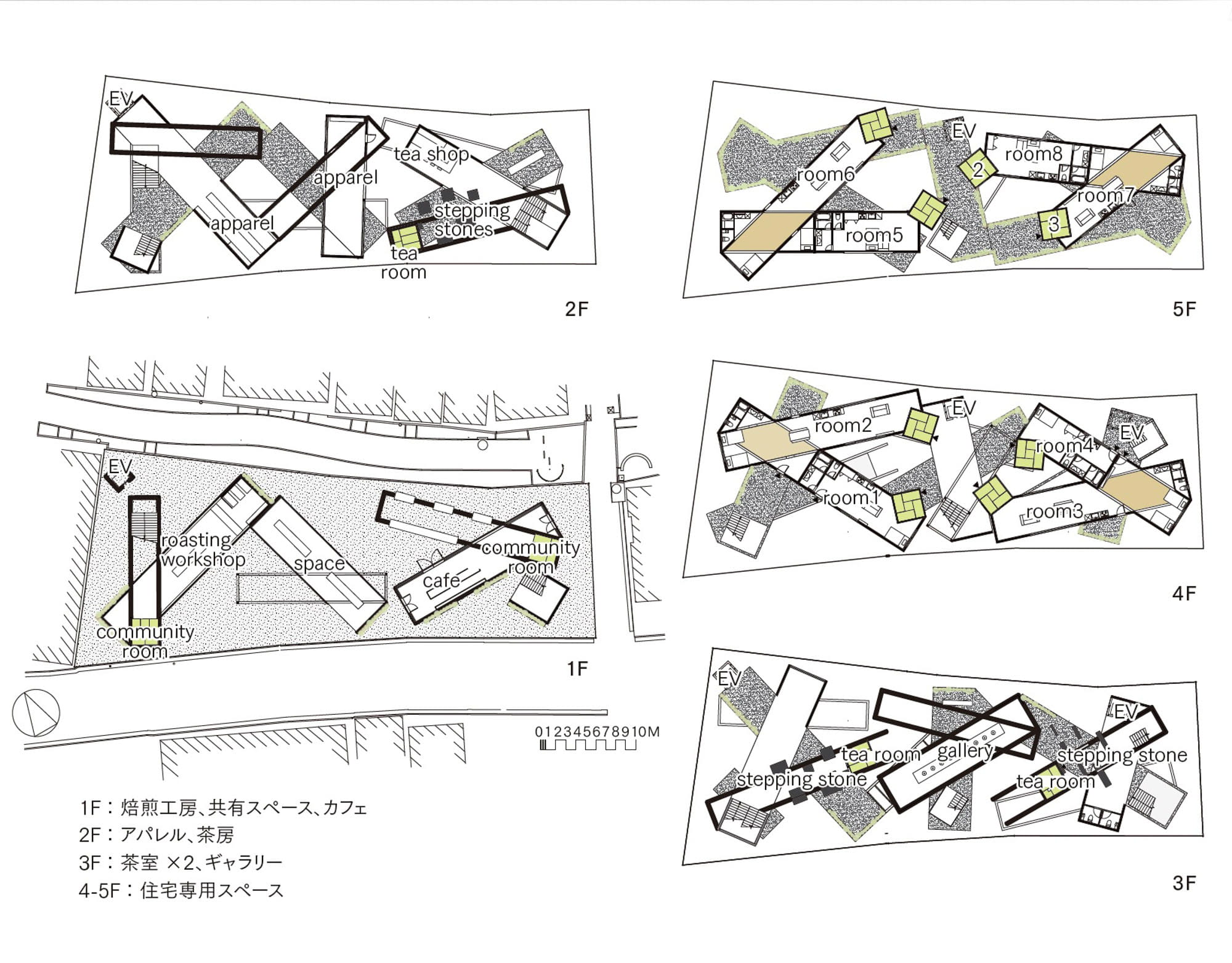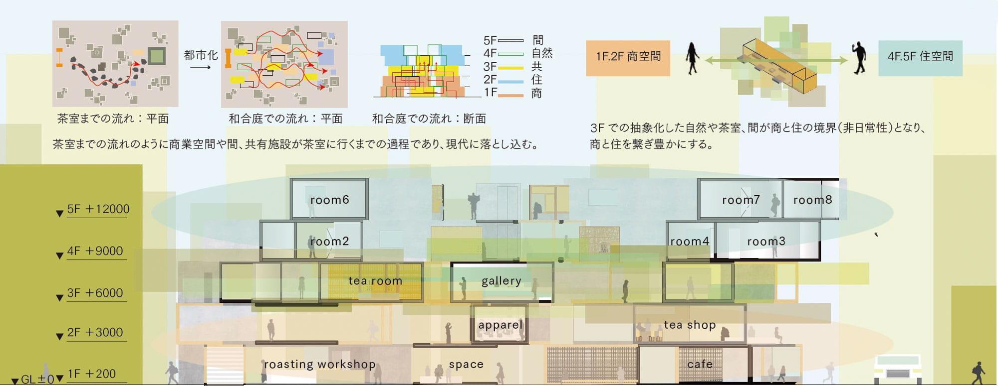 - 神山町は現在、オフィスビルや老舗商店、カフェが並ぶ直線的で無機質な町並みが広がっているが、俯瞰して見ると賑やかな渋谷駅周辺と落ち着いた富ヶ谷の住宅街のちょうど中間に位置し、人や景観にどこか曖昧で柔らかな空気が漂っている。明治時代には茶畑が広がっていた。その歴史的背景を踏まえ、茶の湯文化にある「露地(庭)から茶室へ」という空間構成や、「招く・招かれる」という人と人との関係性、そして日本建築の特徴である「虚(うつ)空間=余白・間」を現代に再解釈し、柔軟で可変的な空間として再構築する。