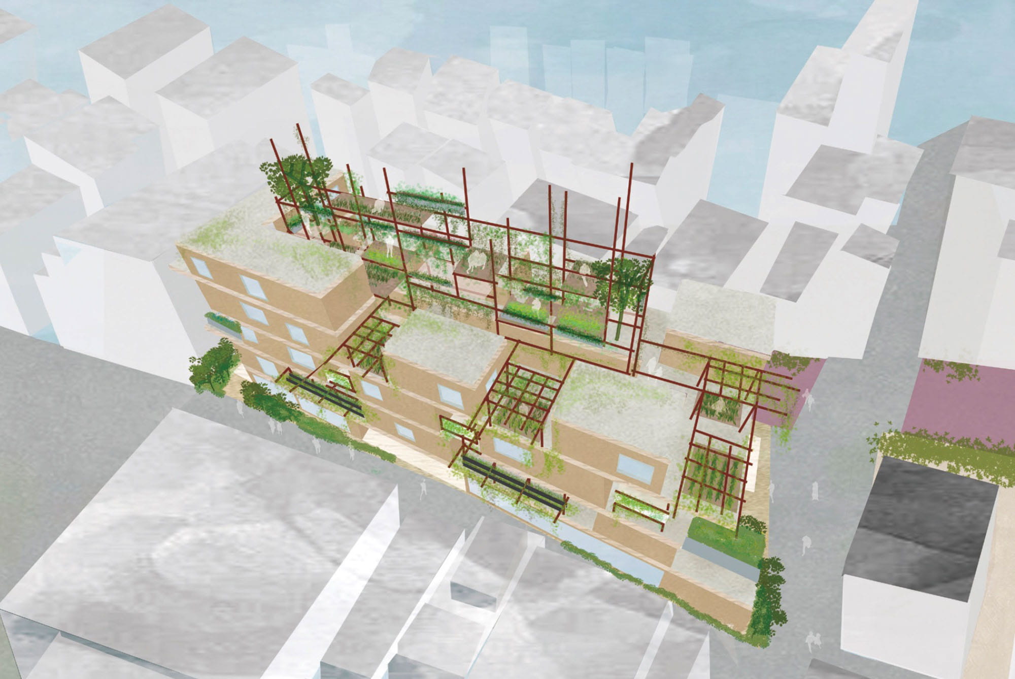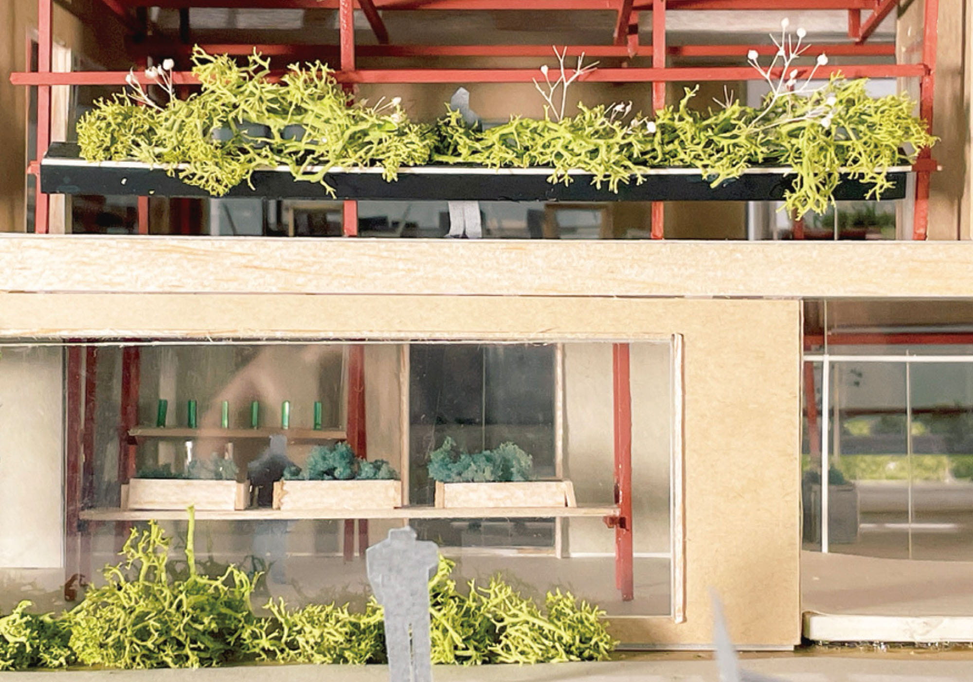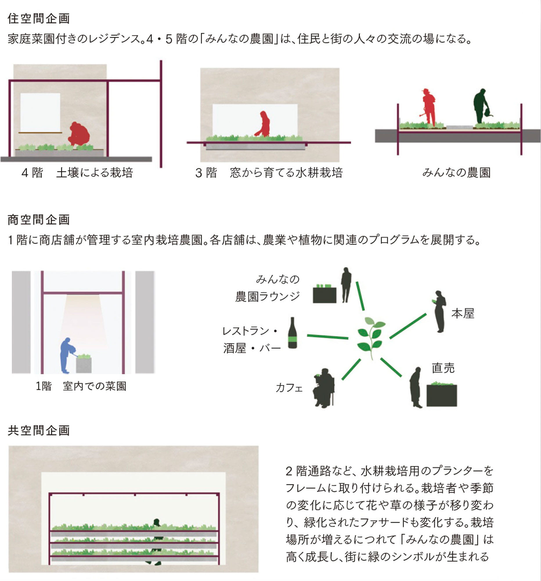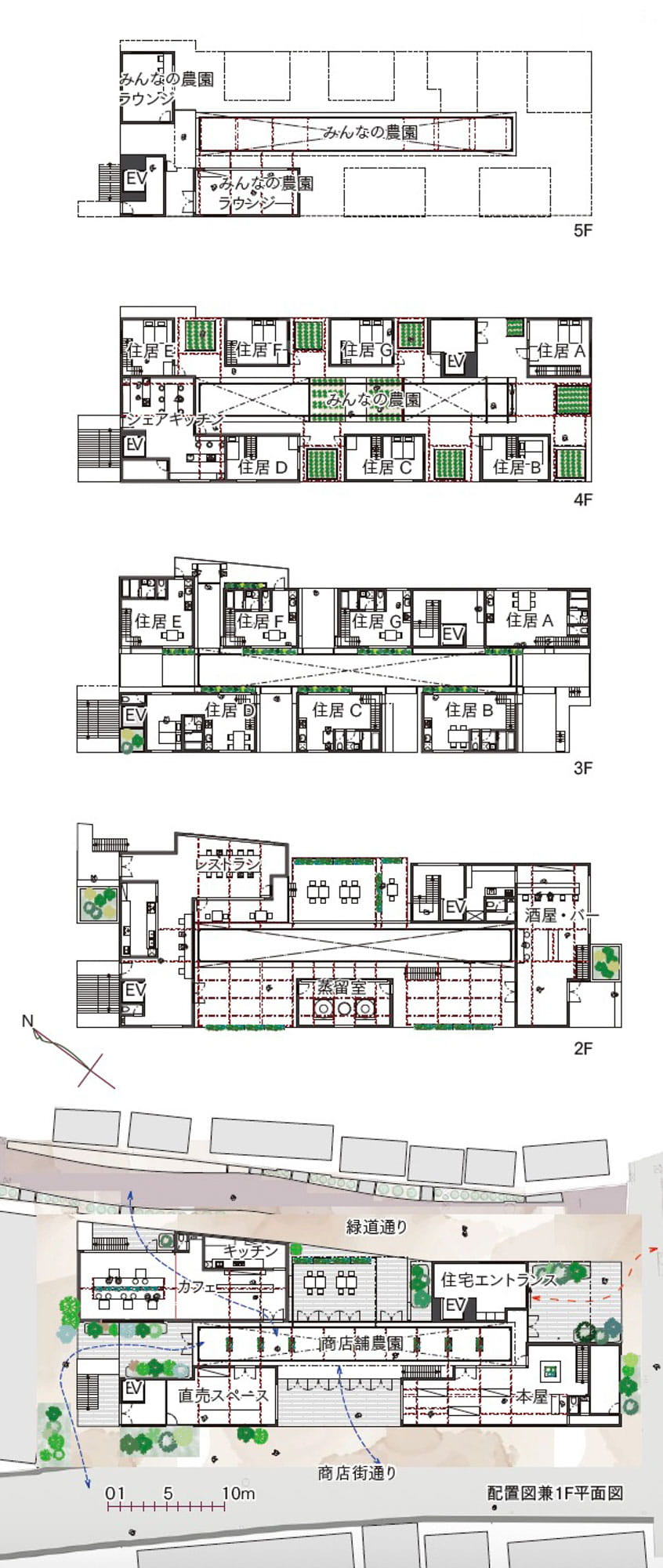 - 渋谷区神山町は高級住宅地と商業地域が混在する。かつて鍋島家の農園が広がり、川を利用した稲作や茶園の風景があった。しかし現在では川が暗渠となり、自然の面影は失われている。本提案では、かつて神山町に根付いていた「農業」や「自然」を、フレームを介して建築全体で「再耕」し、新たな農業体験を創出する。農業を通じて人と自然、文化だけでなく、フレーム自体も成長し、神山町に緑のシンボルを生み出す。農園は、住民と商業がつながる場となり、多様な人々が交流できる空間を創出する。