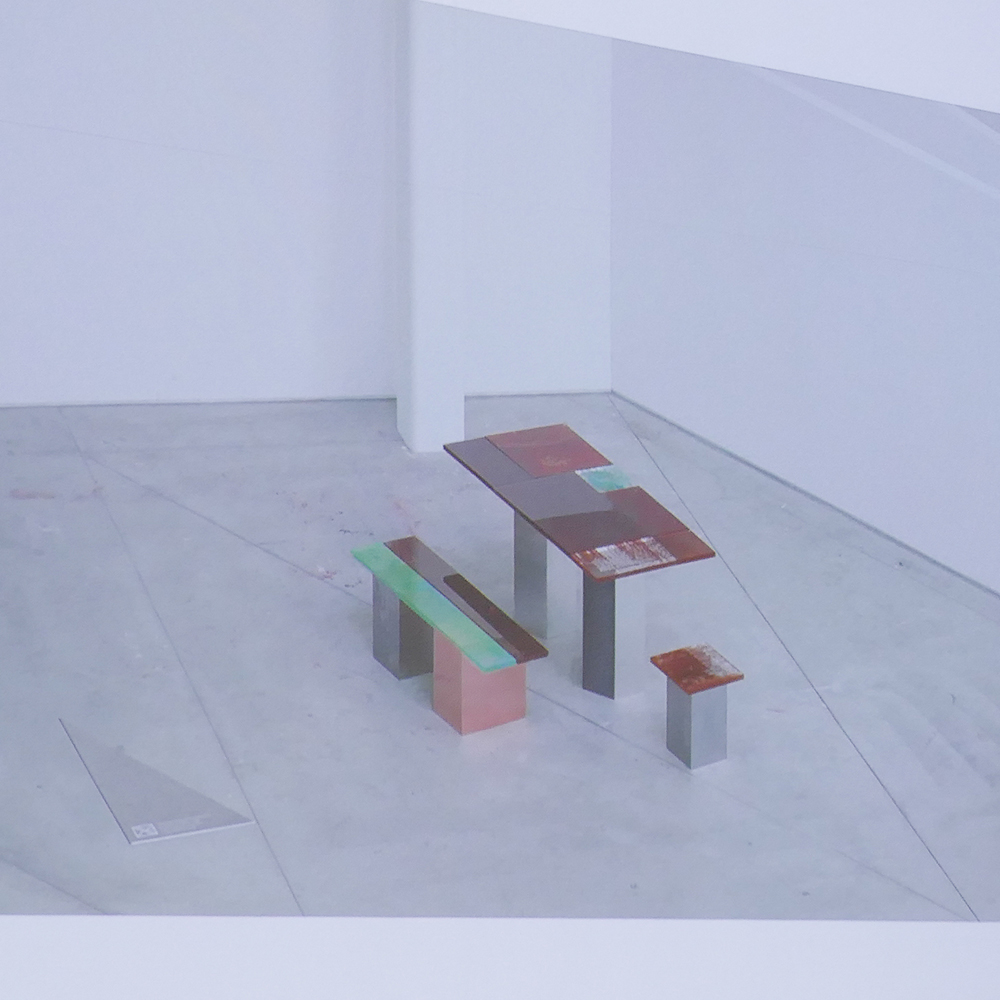 以前の作業場であった造船場で、よく目にする錆をモチーフにプロダクトができないかと思いついたことから始まったプロジェクト。これは金属板を放置(海水に漬ける→雨ざらしにしておく→土に埋めるなど)し、錆を生成した後、アクリル板に錆のみ転写した板を家具やプロダクトに落とし込んだ作品。狩野さん曰く野菜作りのように、こまめに金属板をお世話をすることが大事とのことで、大型の依頼を受けた際でも、錆づくりから転写まで一つひとつ手作業で行っているという。これまでの人類の歴史上、錆は死を連想させるため、どうしてもネガティヴなイメージを持たれがちであった。それが今回、錆であること忘れてしまいそうなほど綺麗な模様を使ったテクスチャーを生み出すことで、錆本来の可能性を広げられたという。