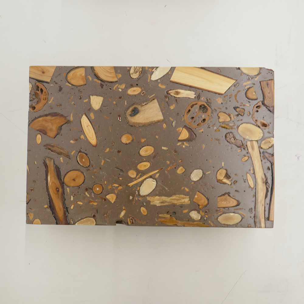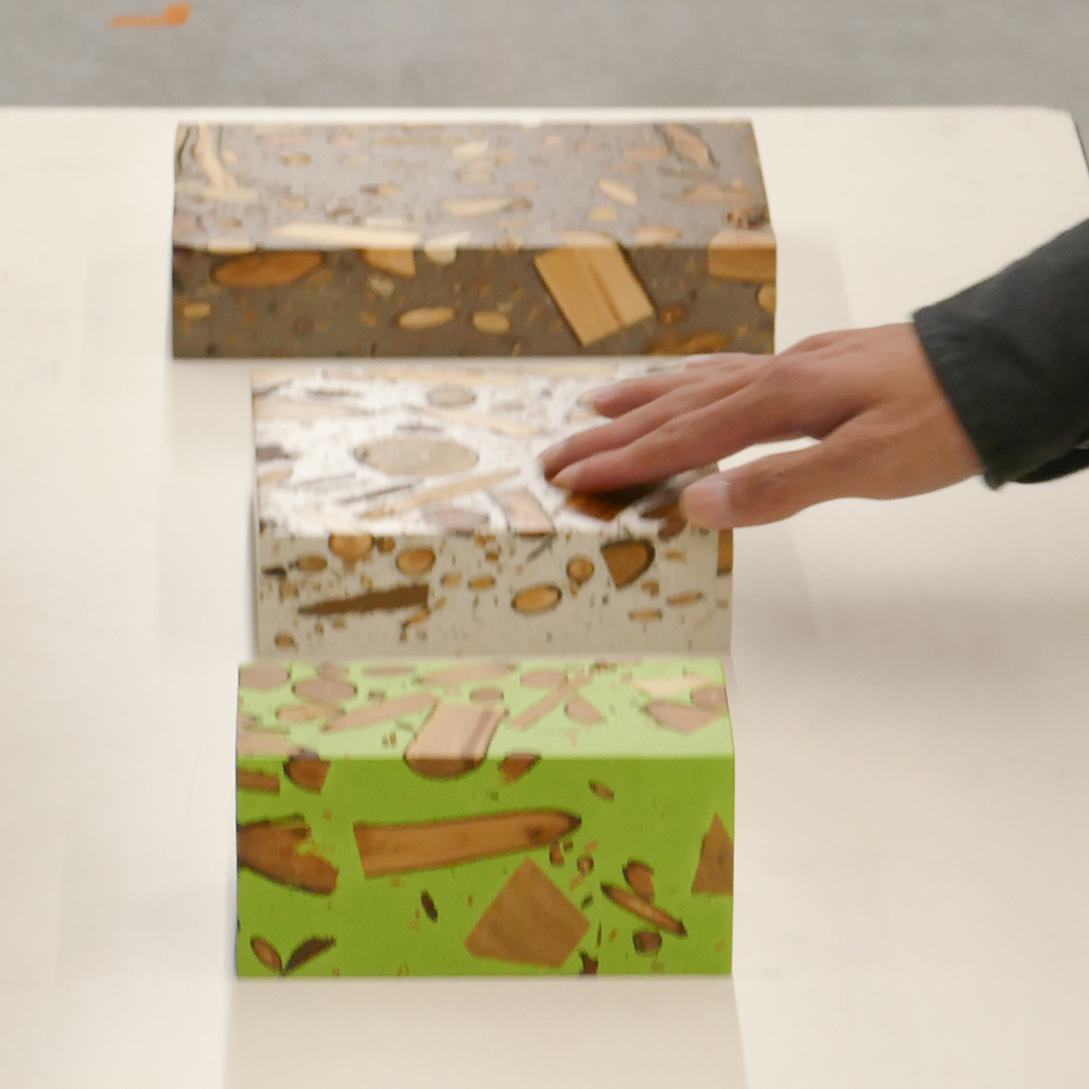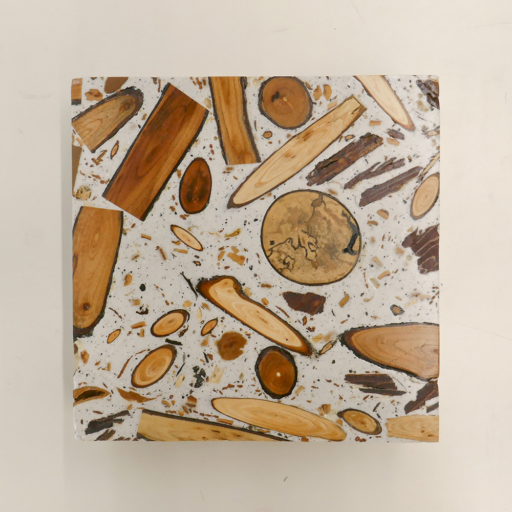 国産材を活用する為のプロジェクトで訪れた飛騨の森が美しかったことから、森の豊かさをマテリアルにできないかと制作された作品。森に落ちている枝葉、樹皮、実、土などを水性アクリル樹脂で固めたものを切り出したもので、その断面は、枝や樹皮の本来見えない複雑な形が現れ、家具やプロダクト、インテリアのマテリアルとして使われている。特定の地域(街路樹、公園)で剪定された端材を用いることで、その地ならではのストーリーが生まれると同時に、排出されるゴミの量も減らせるとのことで、これまでForest Bankで作り上げてきた総量は12トンにもなるという。現在BAUMの伊勢丹新宿店と阪急梅田店の内装と什器で実際に使われている。