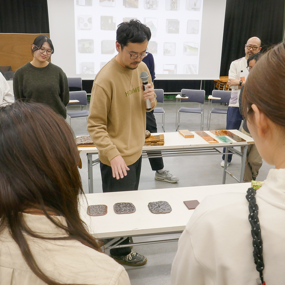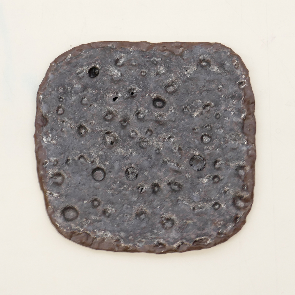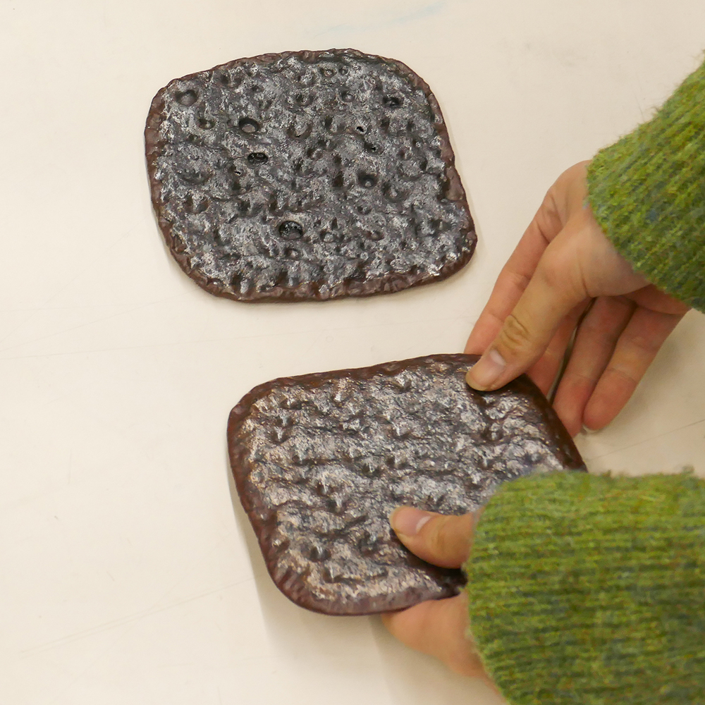 2024年に21_21DESIGN SIGHTギャラリー1&2で行われた「ゴミうんち展」に出展したうんち(循環)をテーマにデザインした作品。トイレに流されたものは下水処理場に流れ、一般的には川や海に放流されるがどうしても最後に汚泥が残ってしまう。焼却され汚泥灰として肥料やセメントなどに使われているが、汚泥灰の素材が焼きものと相性がいいのではと思い、LIXILやきもの工房の協力のもとタイル制作を行なったという。「うんち」が実際に空間の一部として存在することの可能性をデザインできたと述べ、いつか一般的なタイルと同様にうんちタイルも内装材として使ってもらいたいと語った。