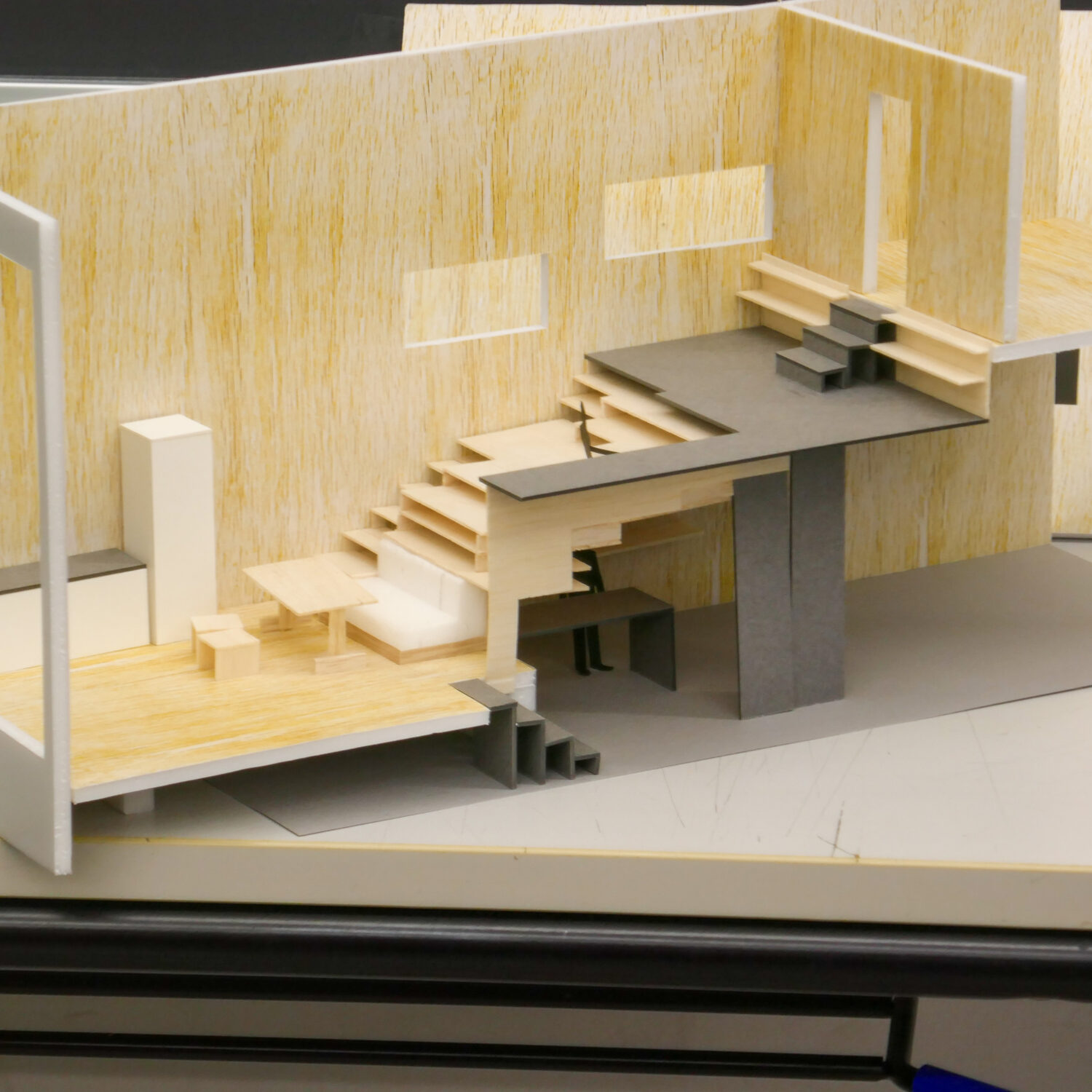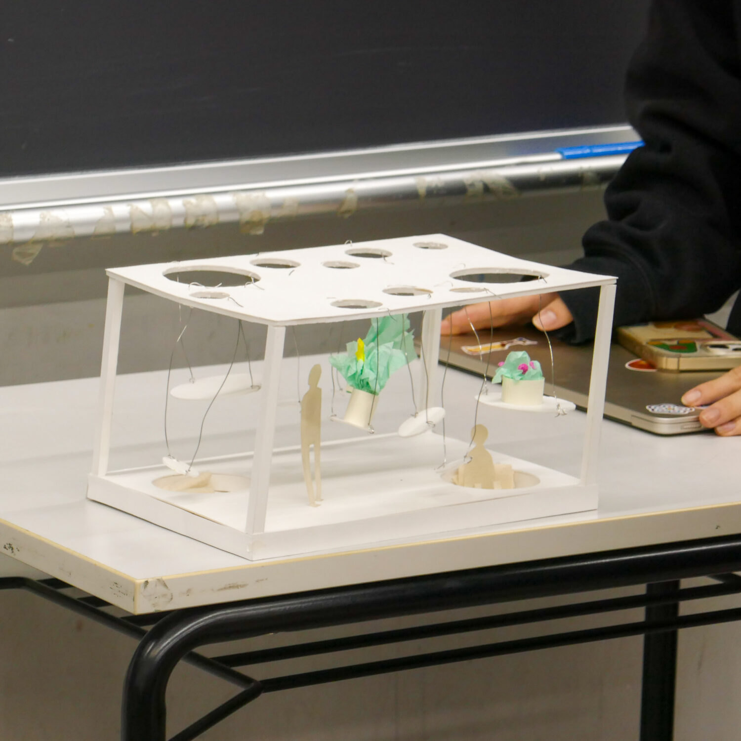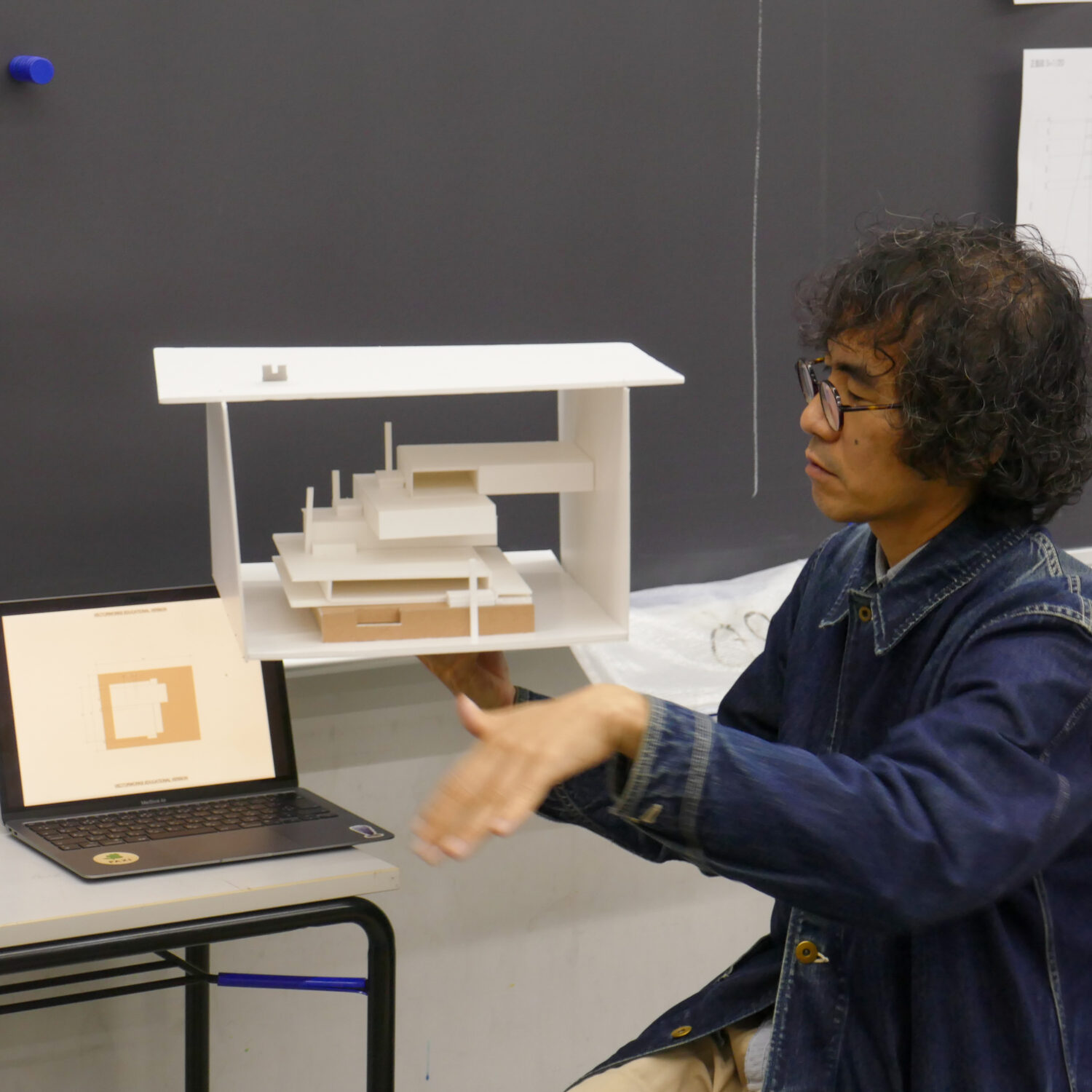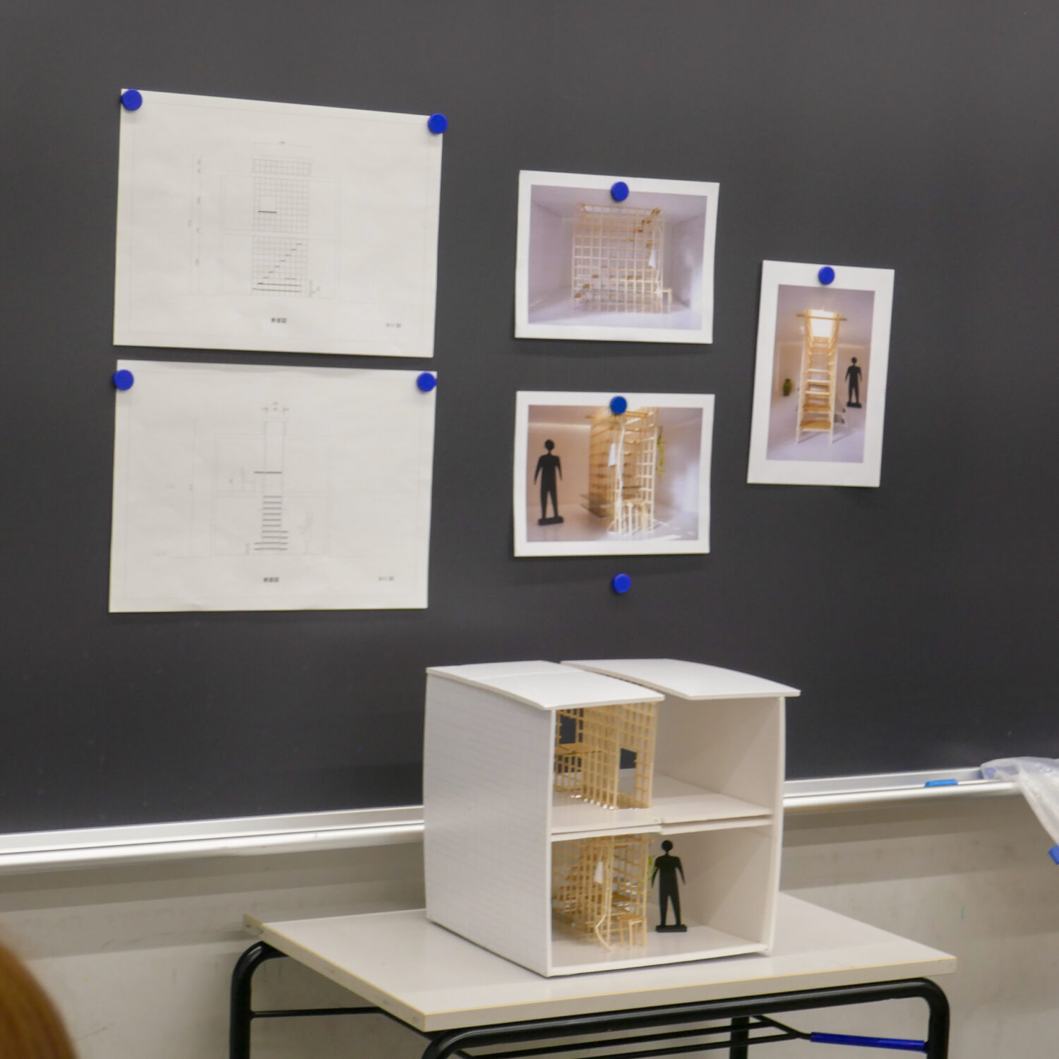中間発表では、模型に加え、平面図・断面図と自分が魅力的に思うカットを撮影した模型写真を持ち寄り、1人2分間ずつ発表を行いました。