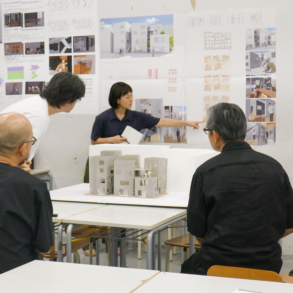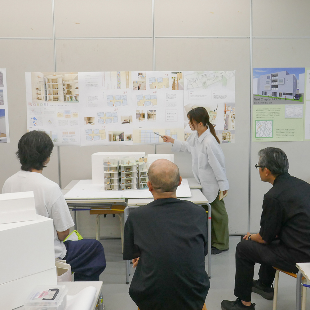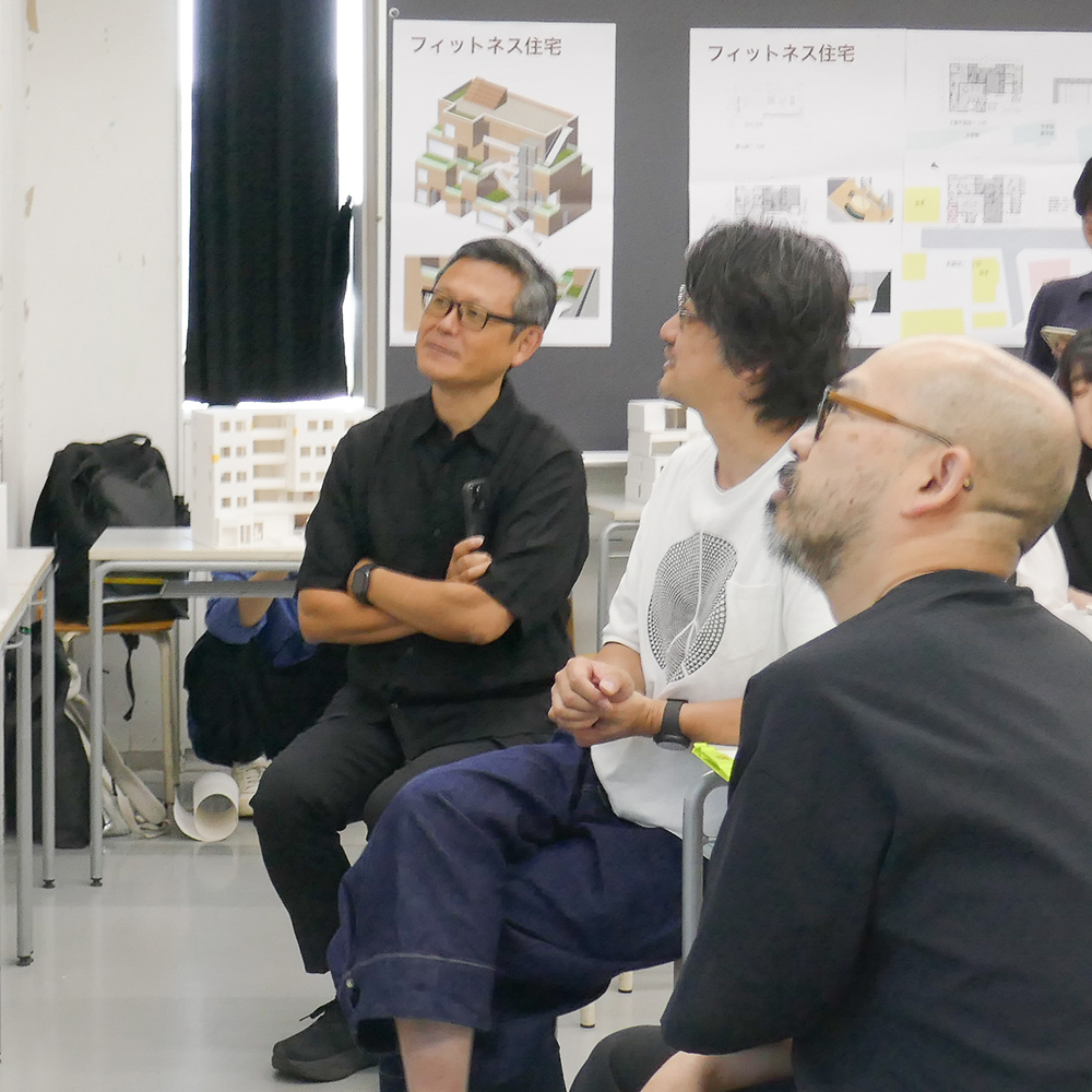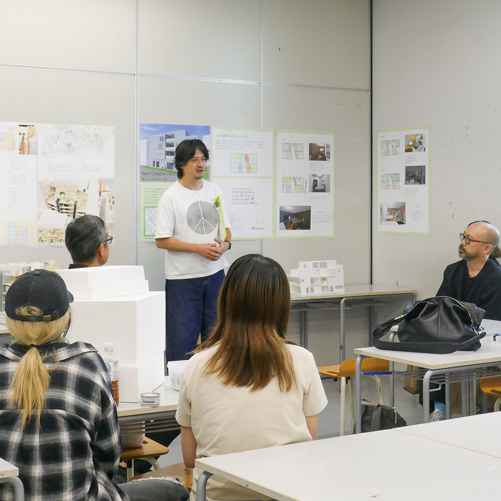 7月28日(月)昼間部3年生の「住環境デザインⅢA」(小山光先生)の授業では、ゲストで建築家の川辺直哉さん(https://www.kawabe-office.com/)と大松俊紀先生(分野責任者)にお越し頂き、最終講評が行われました。
