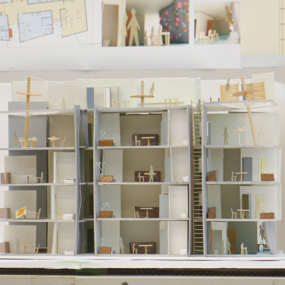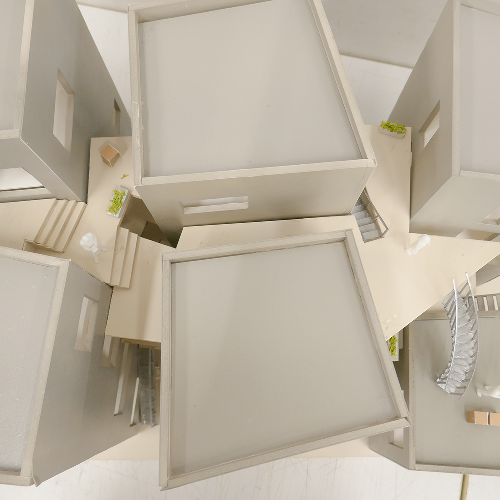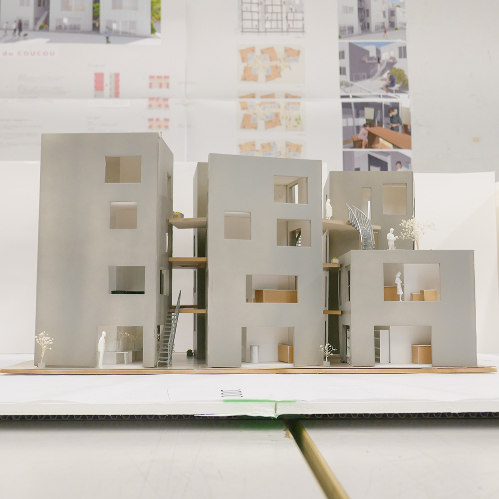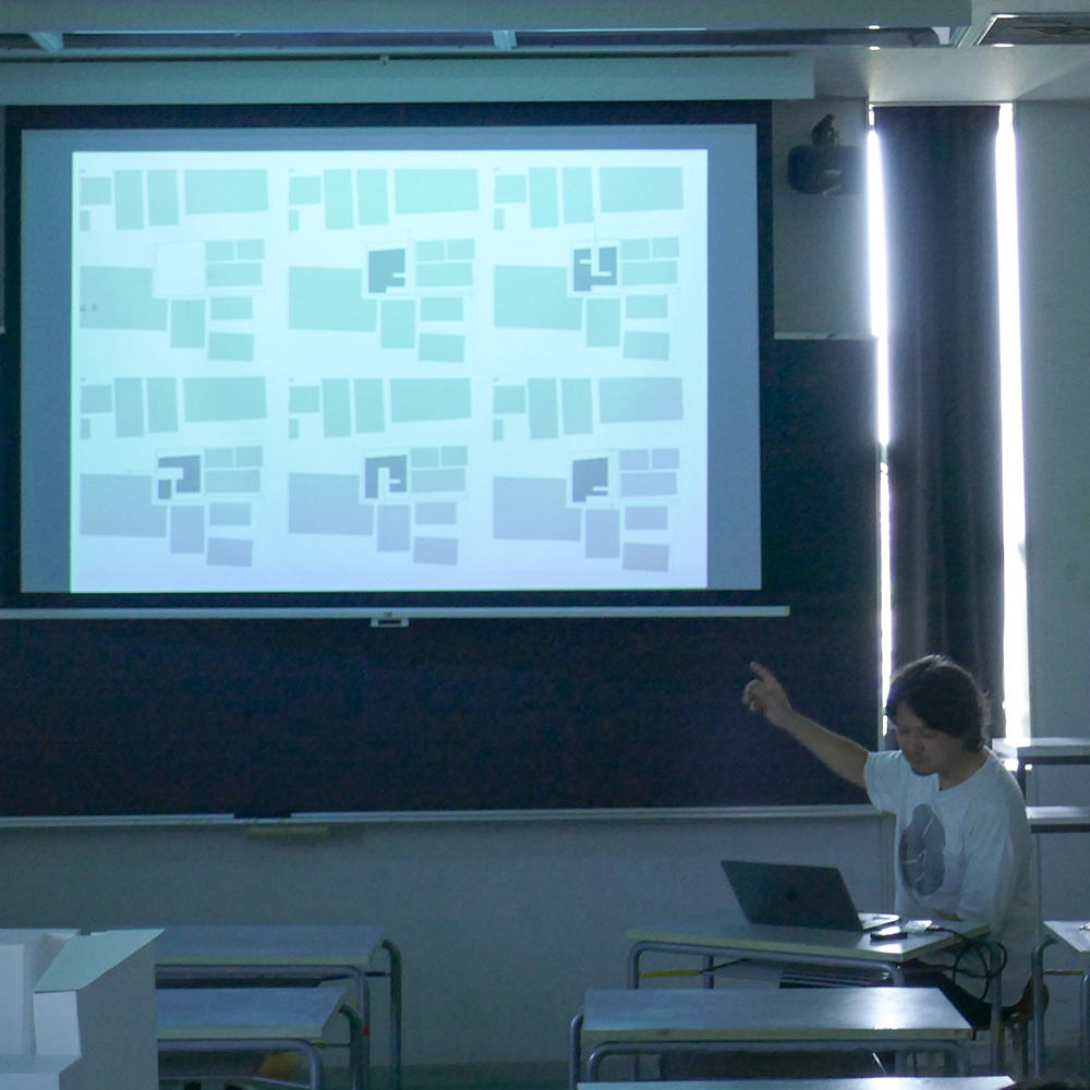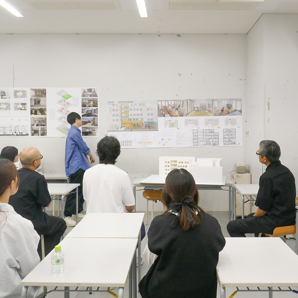 7月28日(月)昼間部3年生の「住環境デザインⅢA」(小山光先生)の授業では、ゲストで建築家の川辺直哉さん(https://www.kawabe-office.com/)と大松俊紀先生(分野責任者)にお越し頂き、最終講評が行われました。