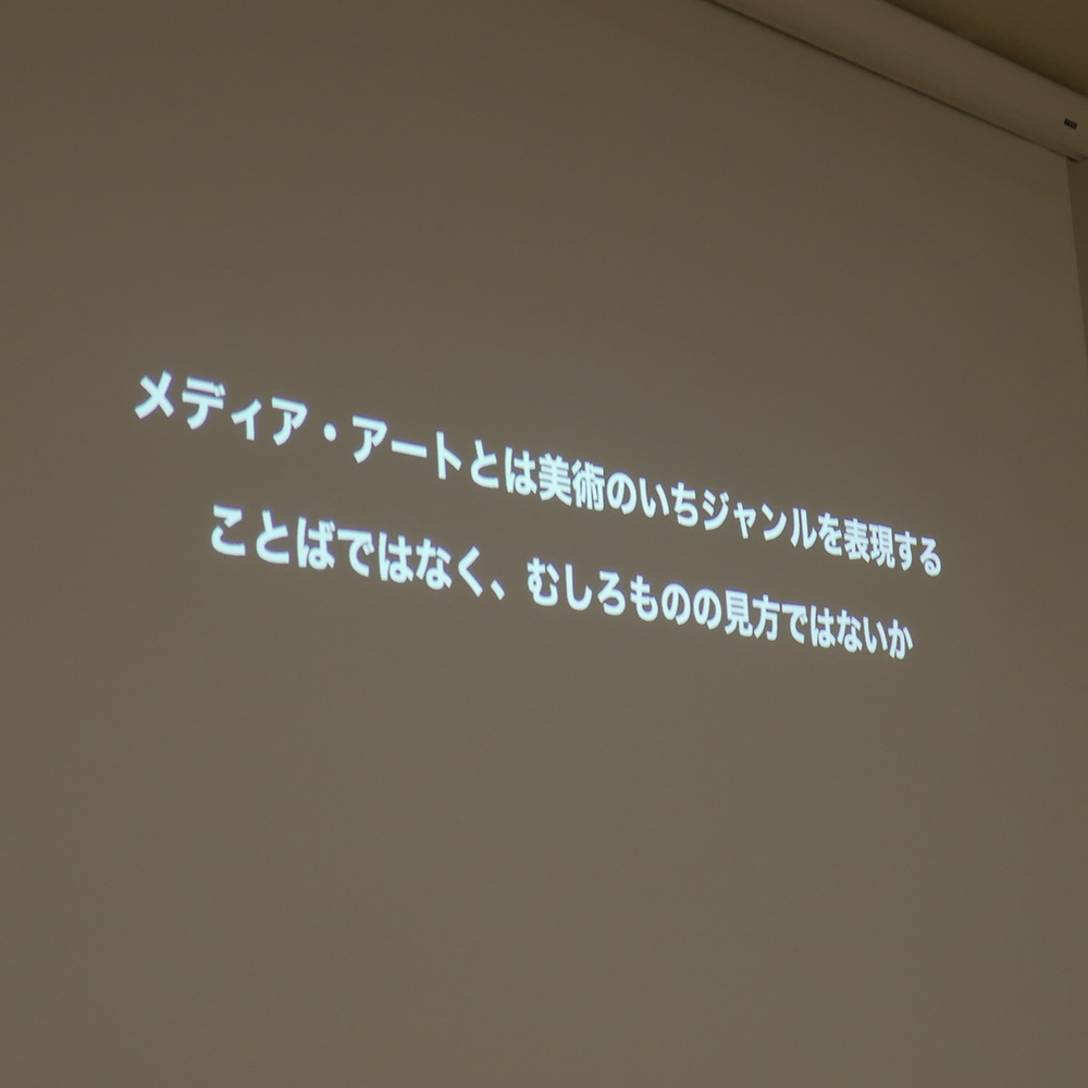 ICCはオープン当時から最先端のテクノロジーを使ったメディア・アート作品を主に展示しており、現在メディア・アートはメディア芸術(漫画、ゲーム、アニメ等)のカテゴリーの一つとされている。しかし畠中さんは、ジャンルを表現する言葉ではなく、むしろものの見方であることと、建築の中にもどんなものの中にもメディアは存在すると述べられました。