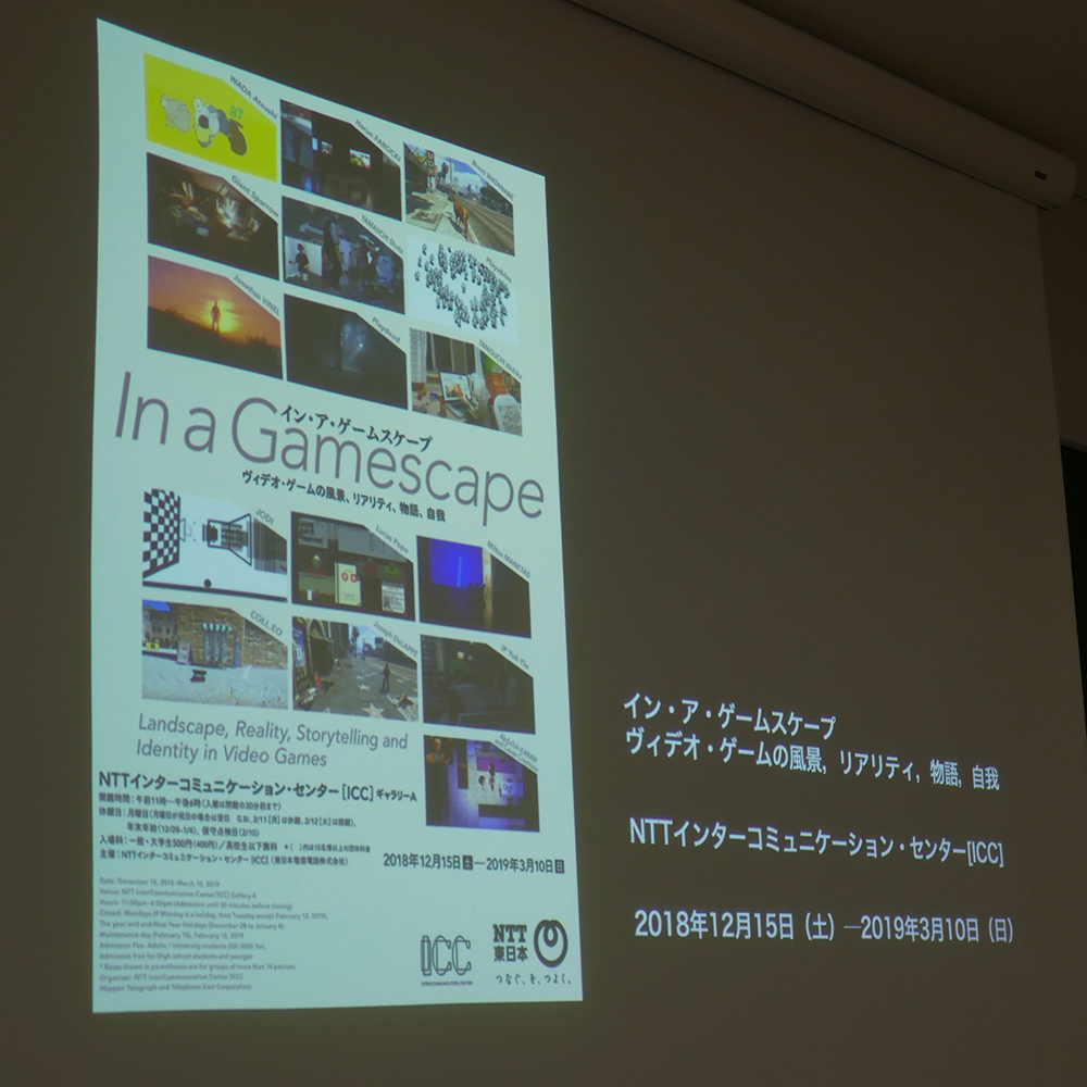 次に過去にICCが取り扱っていたゲームアートについて紹介していただいた。ゲームアートとは、インタラクティブアートの原点であり、バーチャルスペースにおける人間との共存をテーマに80年代の初期から存在する。近年ではビデオゲームをアートのモチーフとして取り入れられ、今でもなお探求されている分野である。ゲームはオルタナティブな人生を一時的に経験する機会を提供するが、同時に「消え去らないもの(現実)」を直面させるものでもある。ただ消えない現実をどう生きるかシミレーションできるのもゲームであると畠中さんは語ります。