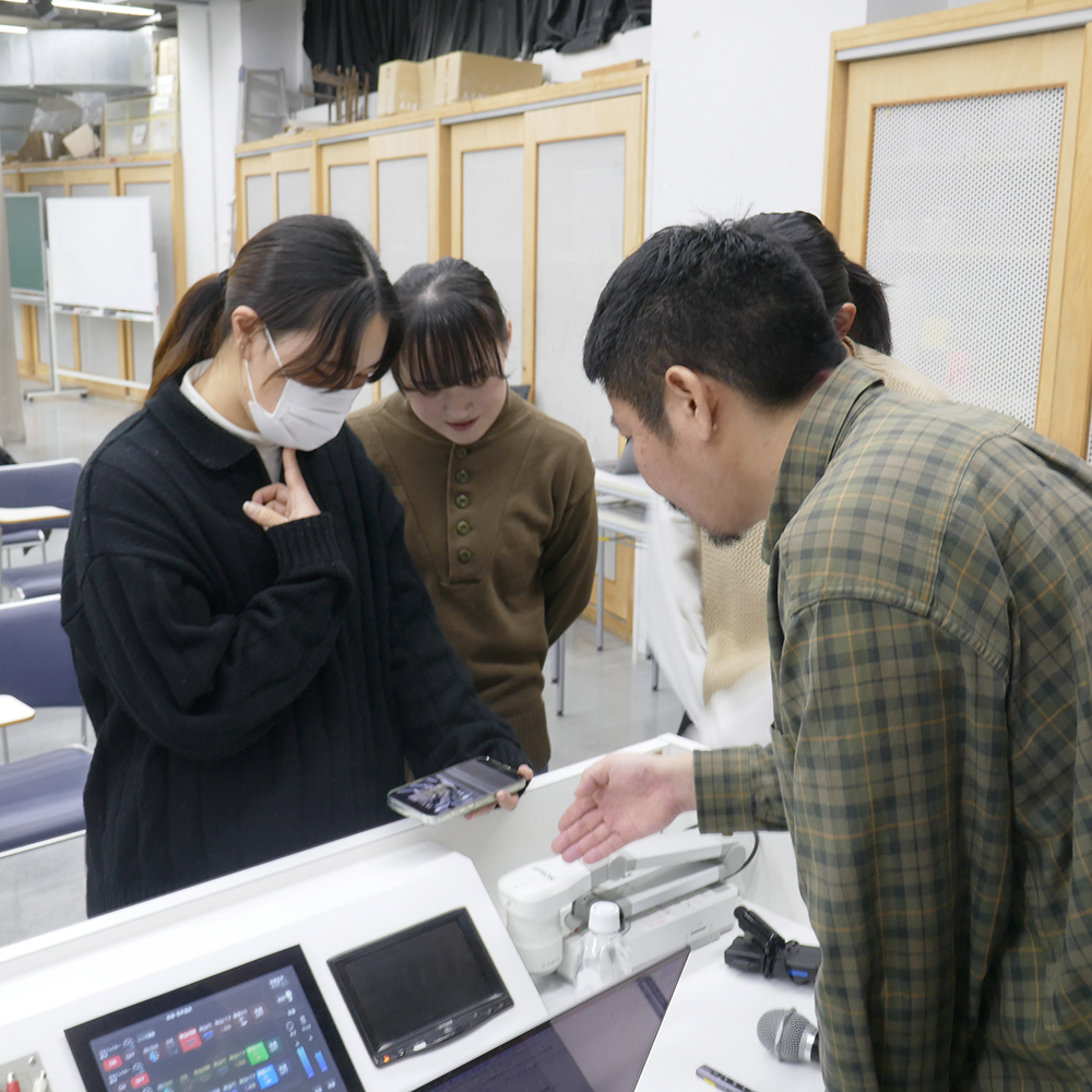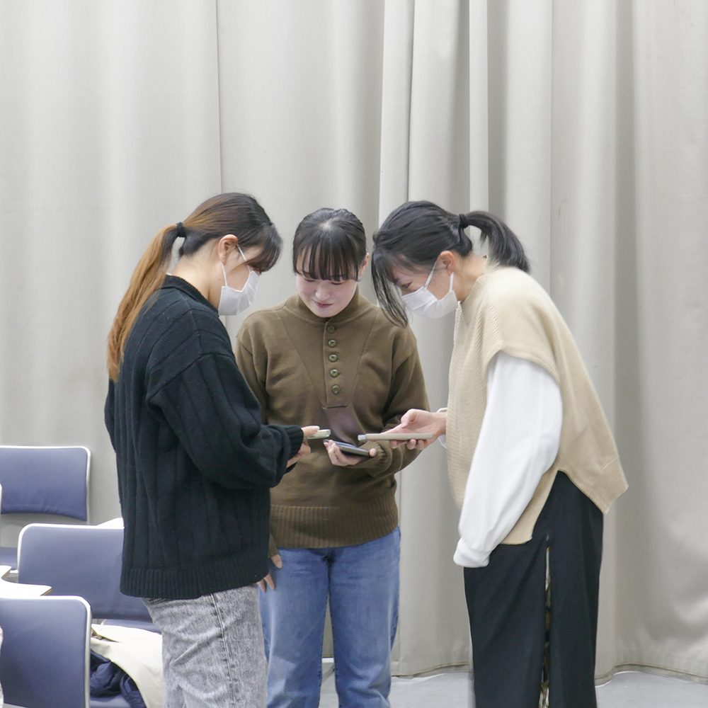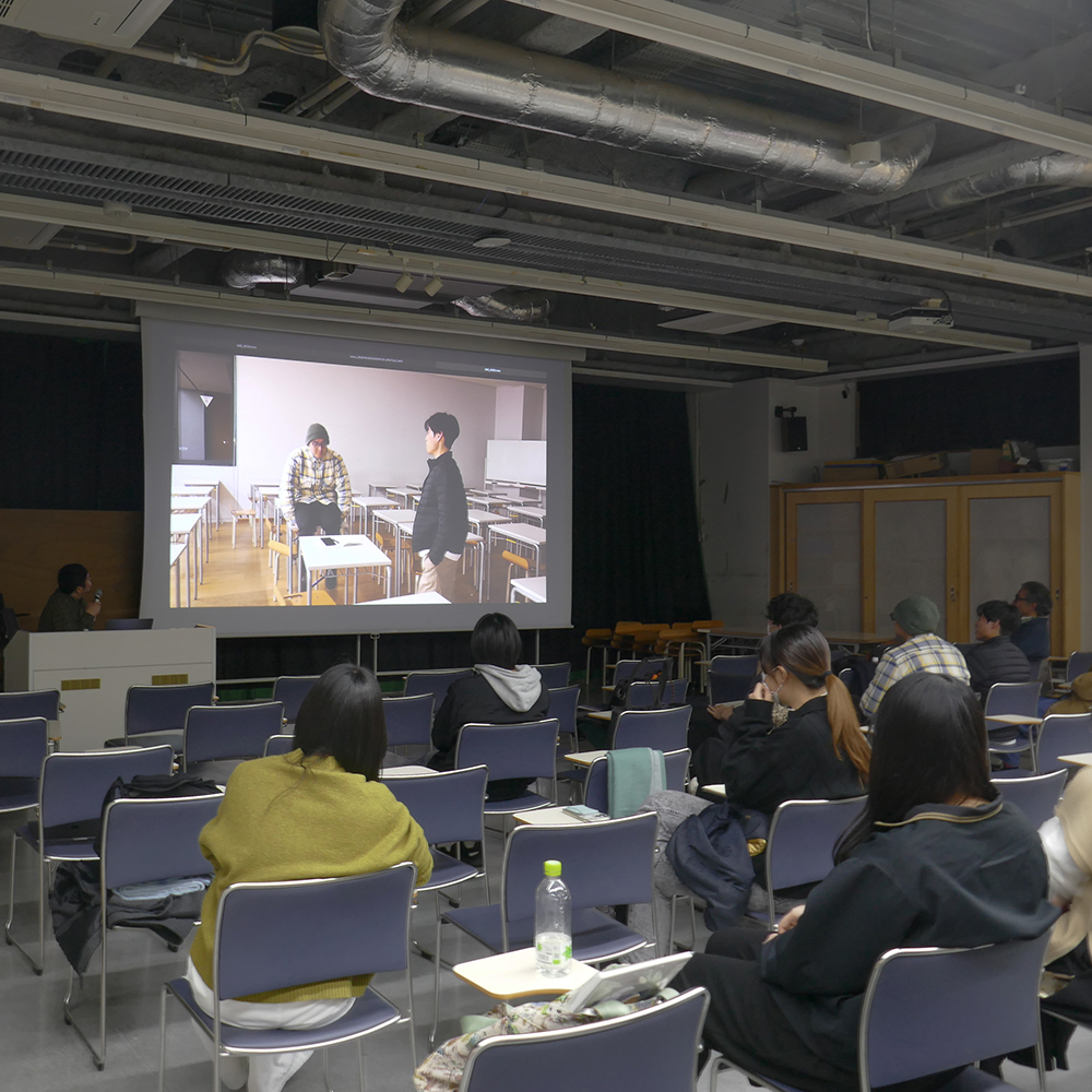 後半では、学生たちが3人で1グループになって映像ワークショップを2つ行いました。1つ目は、自身のカメラ(スマートフォン)を使い、ワンカットでどんな表現ができるかをグループ内で模索し、発表するという内容です。学生たちは大美賀さんにアドバイスをもらいながら、空間をカメラフレームでどう切り取ると、どんな効果が生まれるのか試行錯誤しました。2つ目は、グループ内でそれぞれ頭の中にある思い出(光景、場所、状況など)を話し合い、実際に教室を出てワンカットで再現して撮影してみるという内容です。出来上がった作品はスクリーンに映し、グループごとの発表と大美賀さんによる講評が行われました。