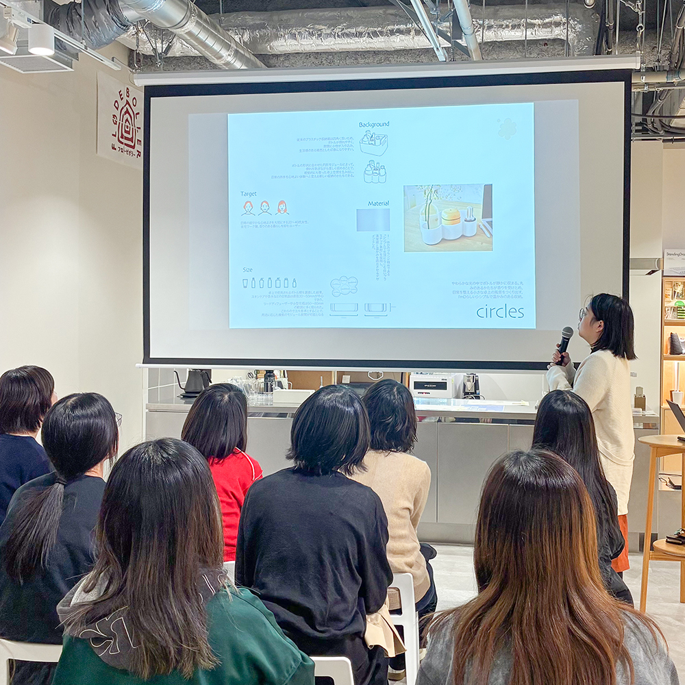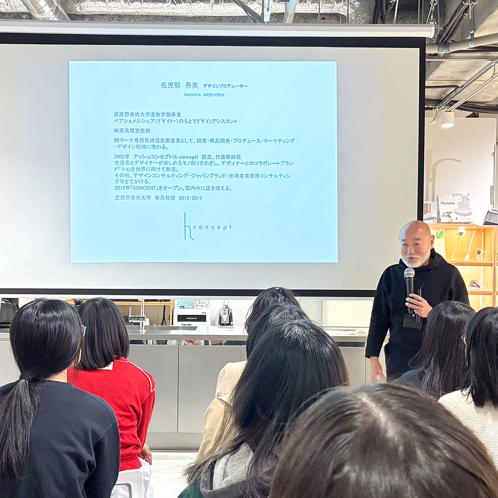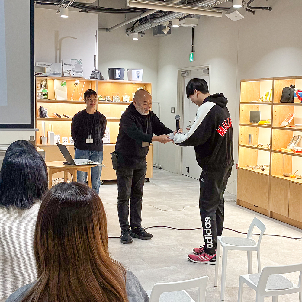 10月28日(火)昼間部3年生の「スペースデザイン特論」の授業は、名児耶秀美先生のデザイン会社(h-concept https://h-concept.jp/)で行われました。前半はスライドで会社や商品の説明をしていただき、後半は、事前に出されていた課題(*)発表と投票が行われました。投票数が多かった上位3名の学生には、先生からプレゼントが贈呈されました。