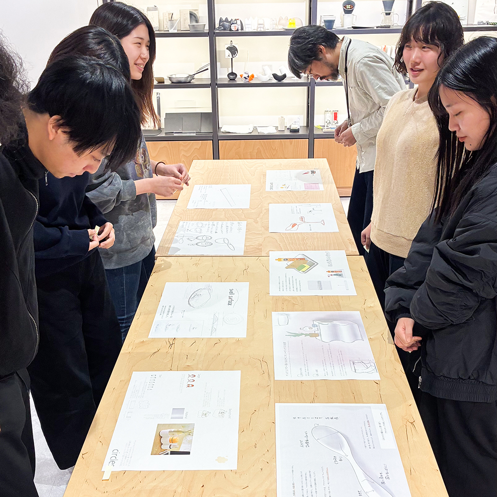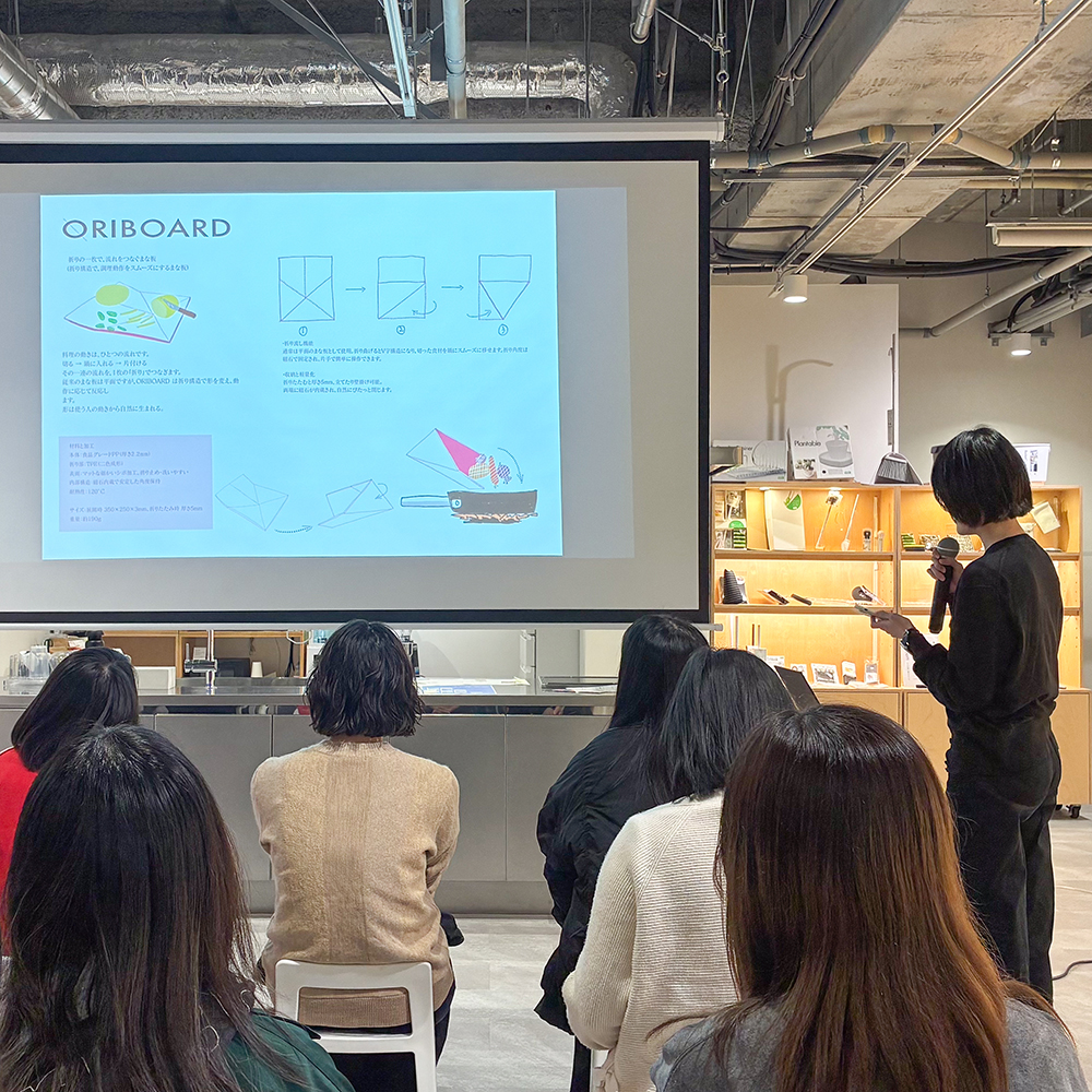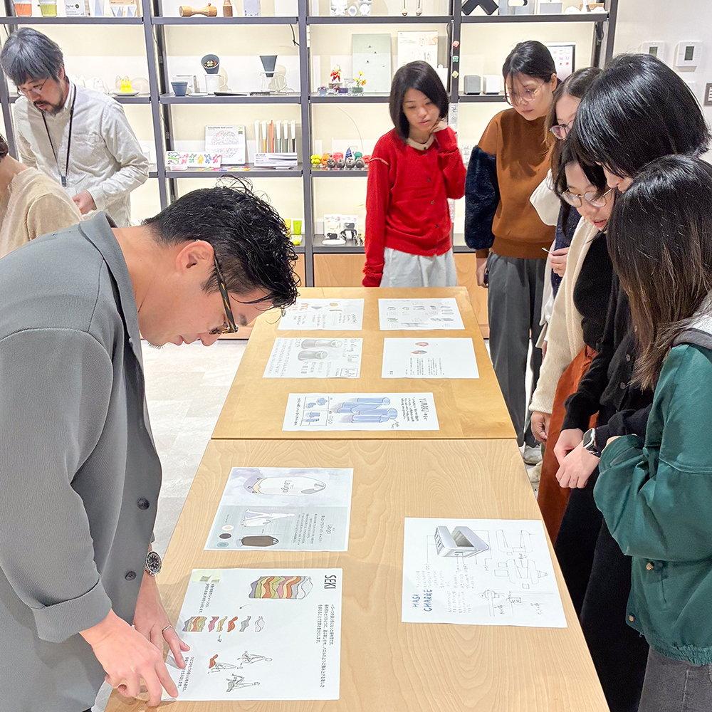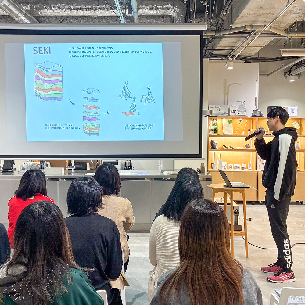10月28日(火)昼間部3年生の「スペースデザイン特論」の授業は、名児耶秀美先生のデザイン会社(h-concept https://h-concept.jp/)で行われました。前半はスライドで会社や商品の説明をしていただき、後半は、事前に出されていた課題(*)発表と投票が行われました。投票数が多かった上位3名の学生には、先生からプレゼントが贈呈されました。